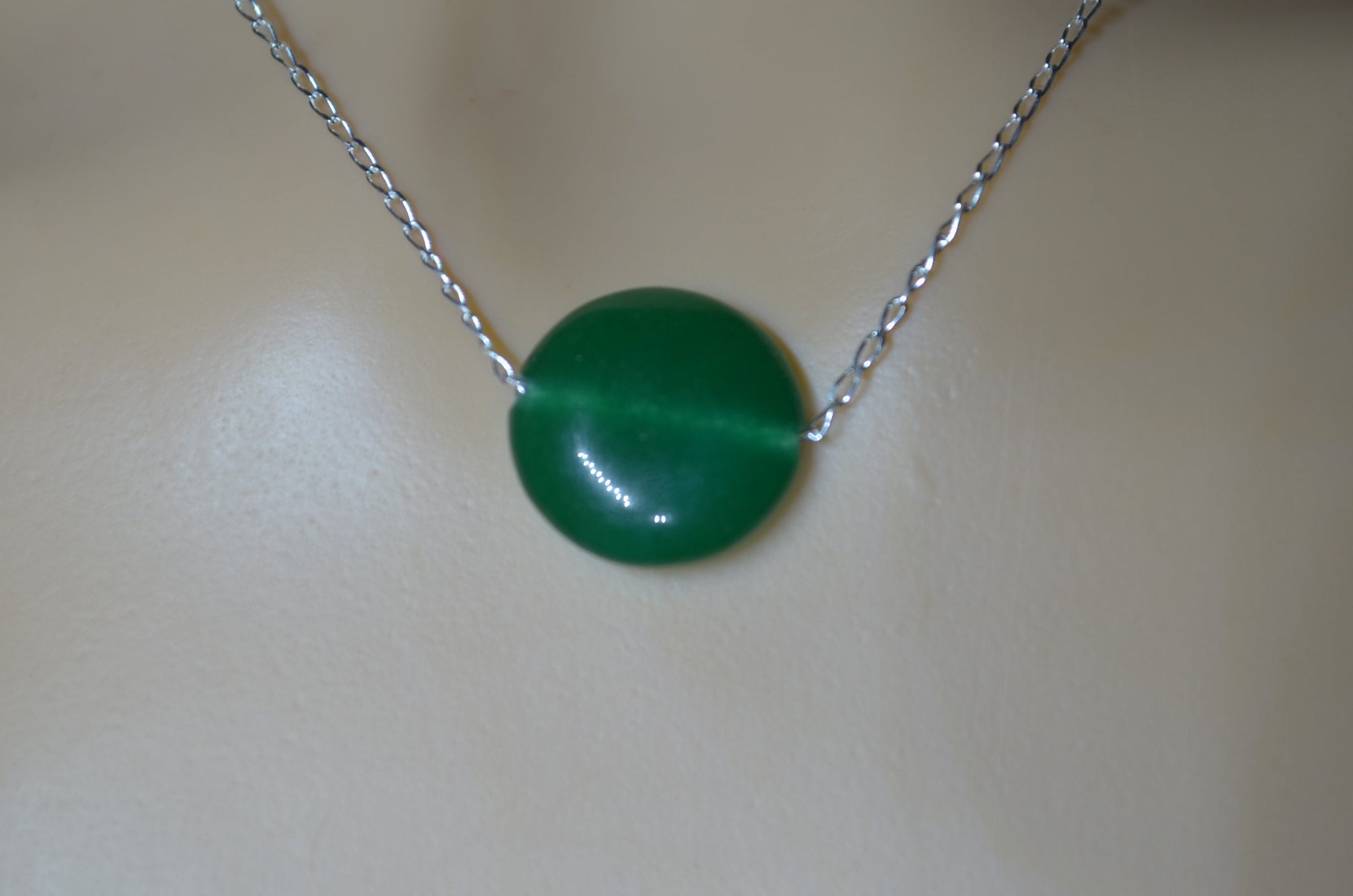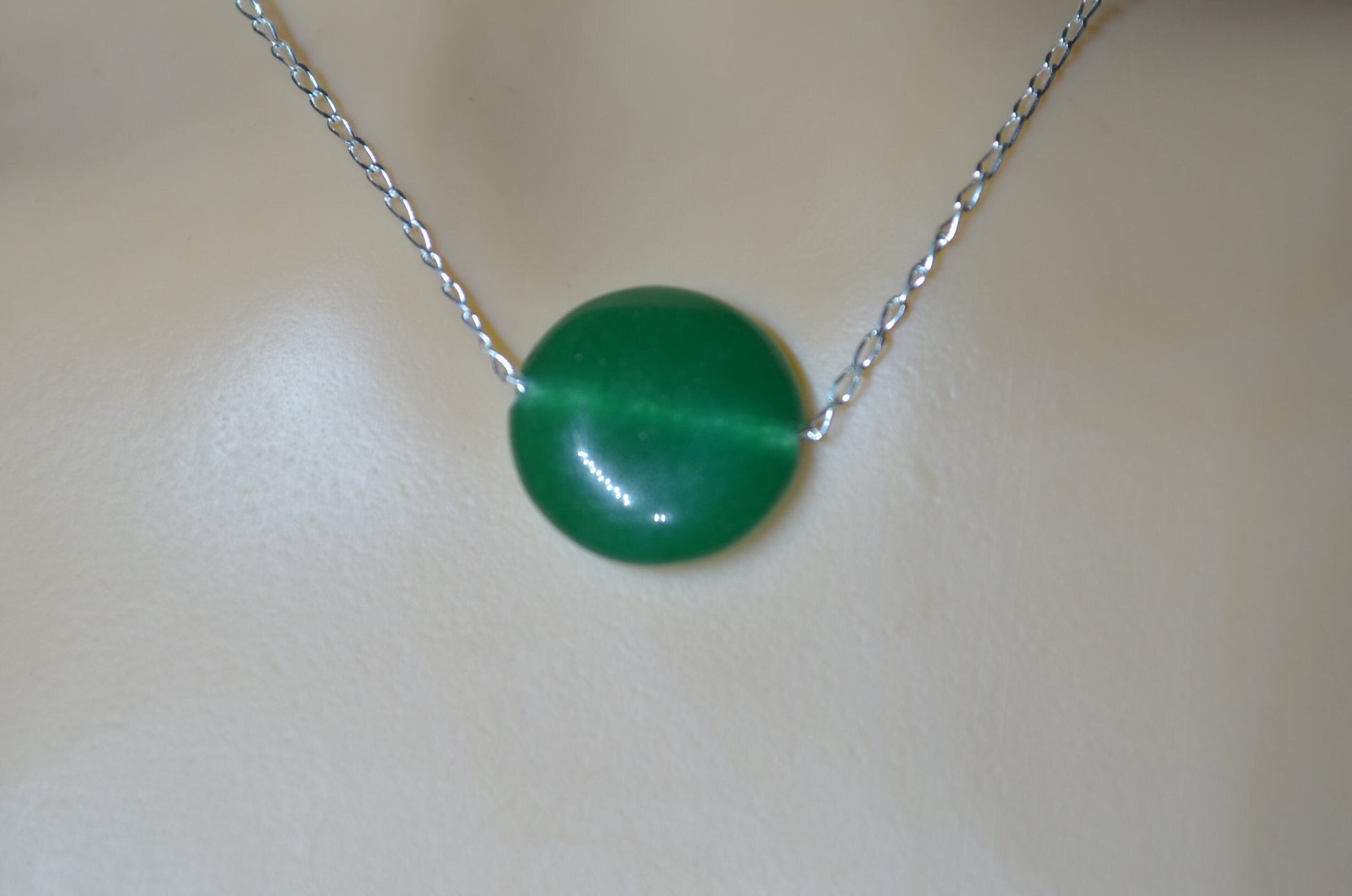 green onyx silver chain necklace, circle shape natural gemstone, 18” chain