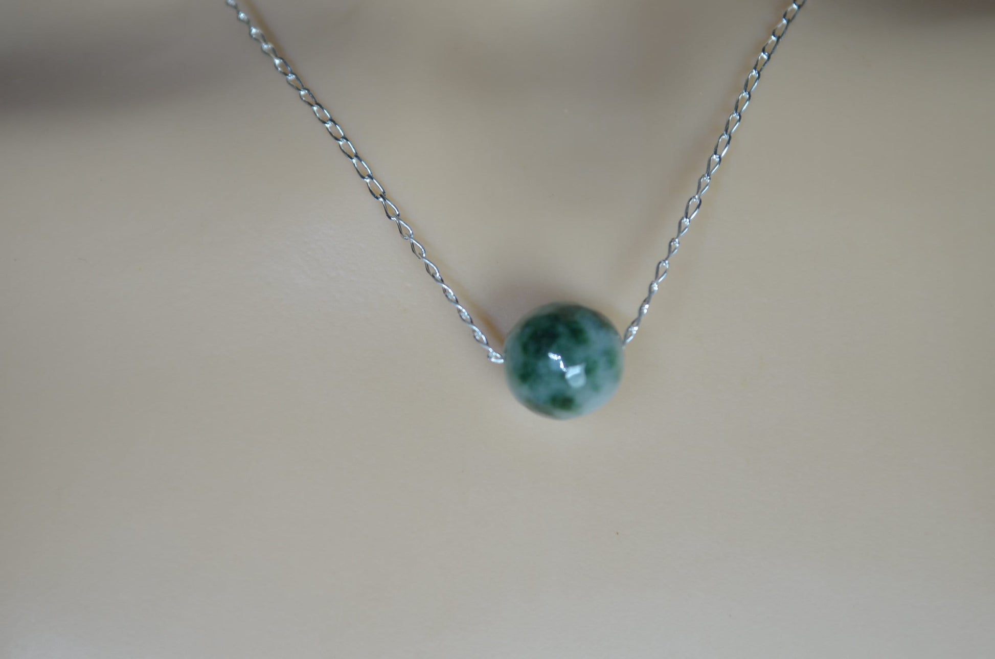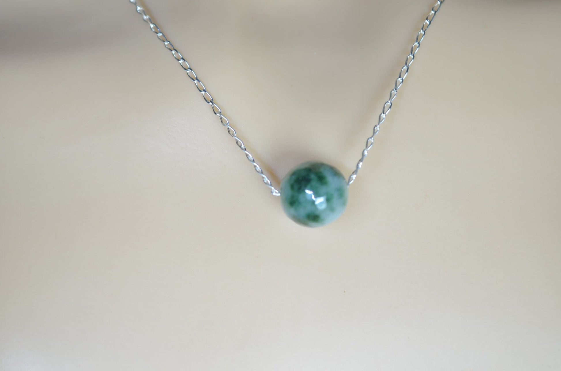 jade silver pendant and solid sterling silver chain necklace, bell shape spotted green natural gemstone