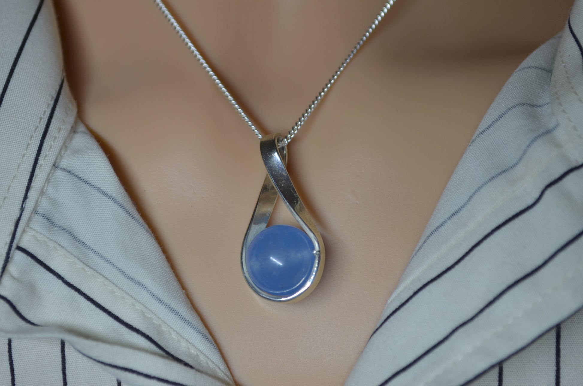 Silver blue jade bead necklace, round stone pendant, natural materials, 18” chain