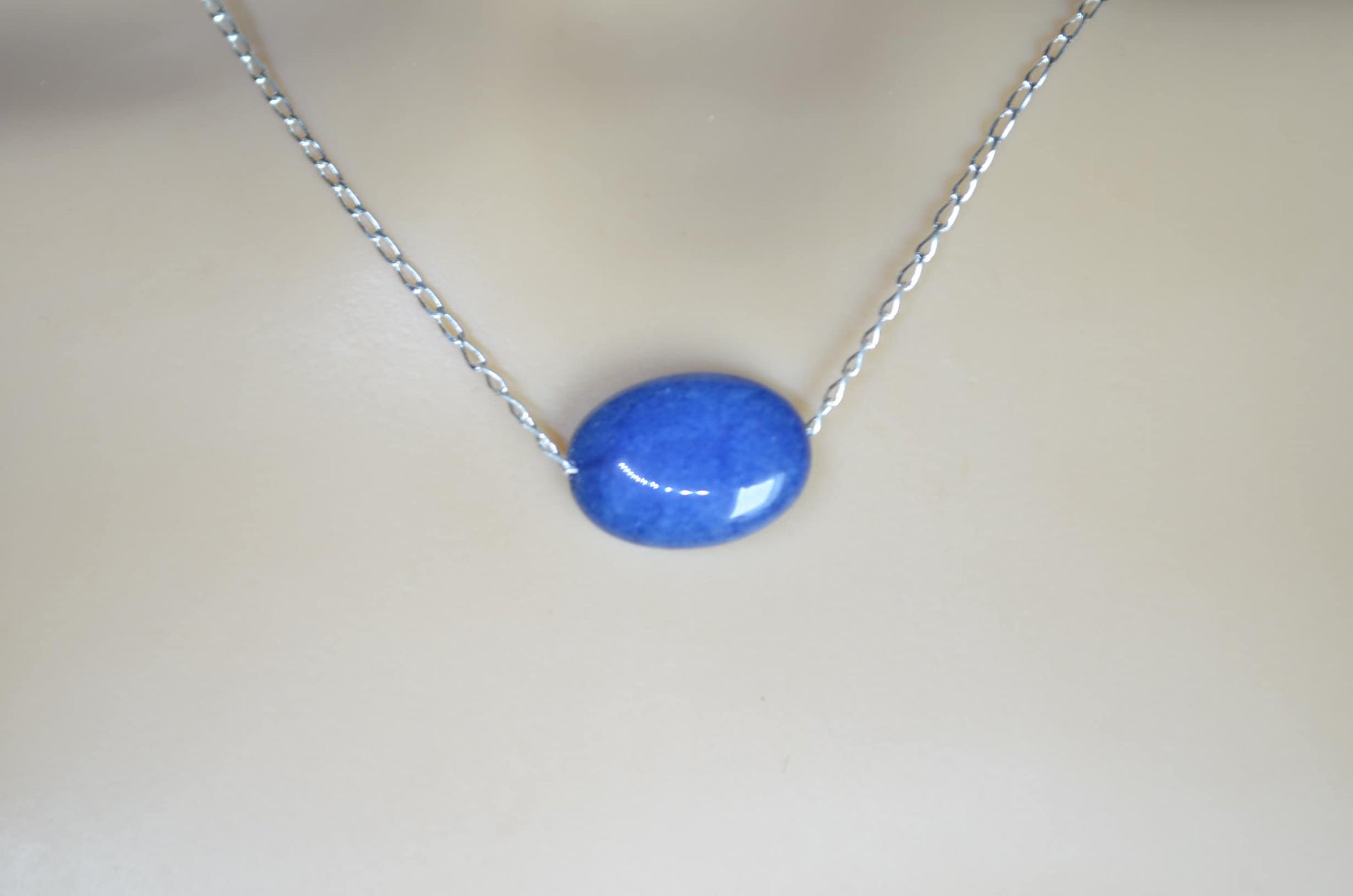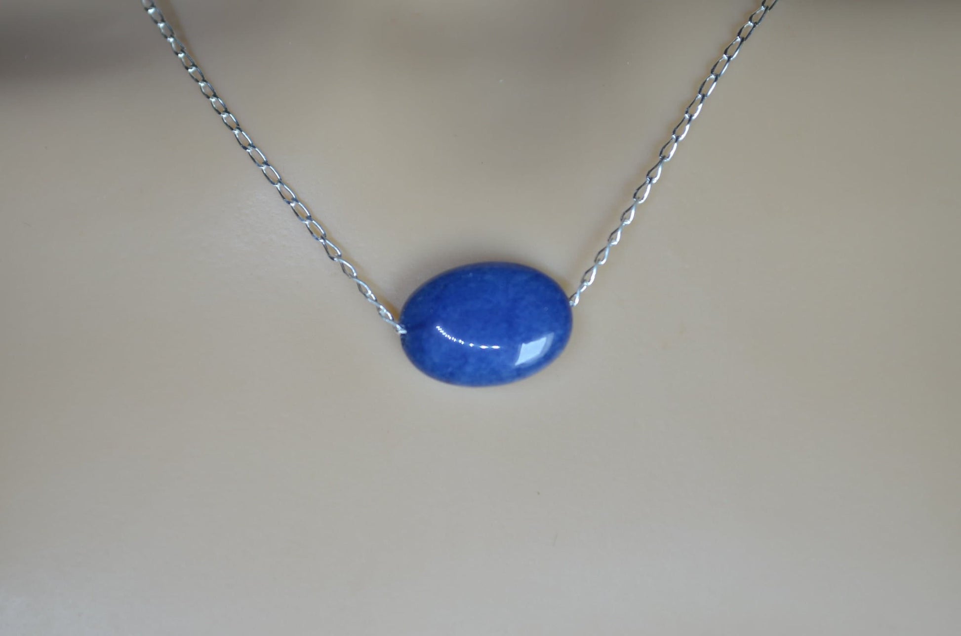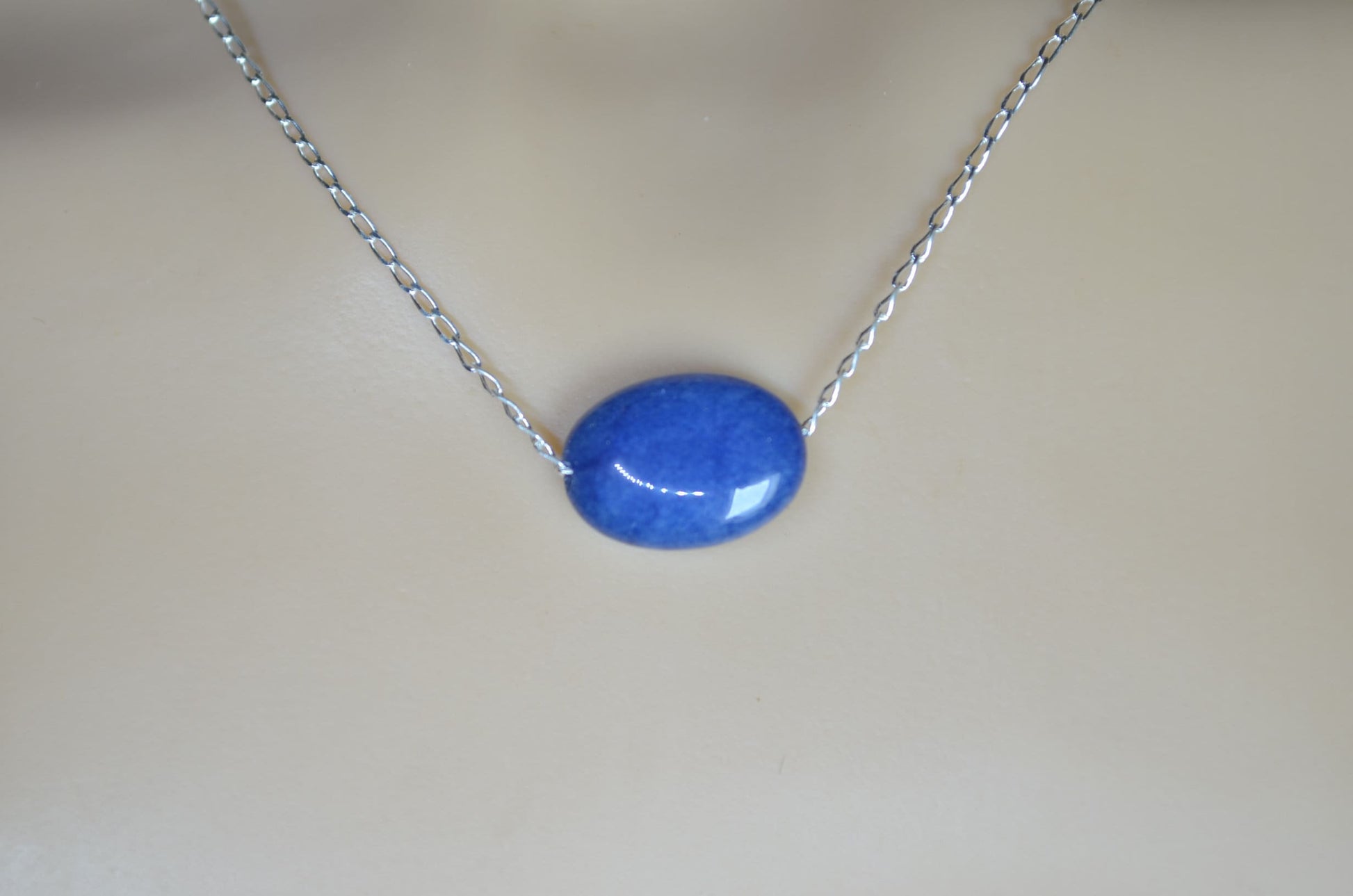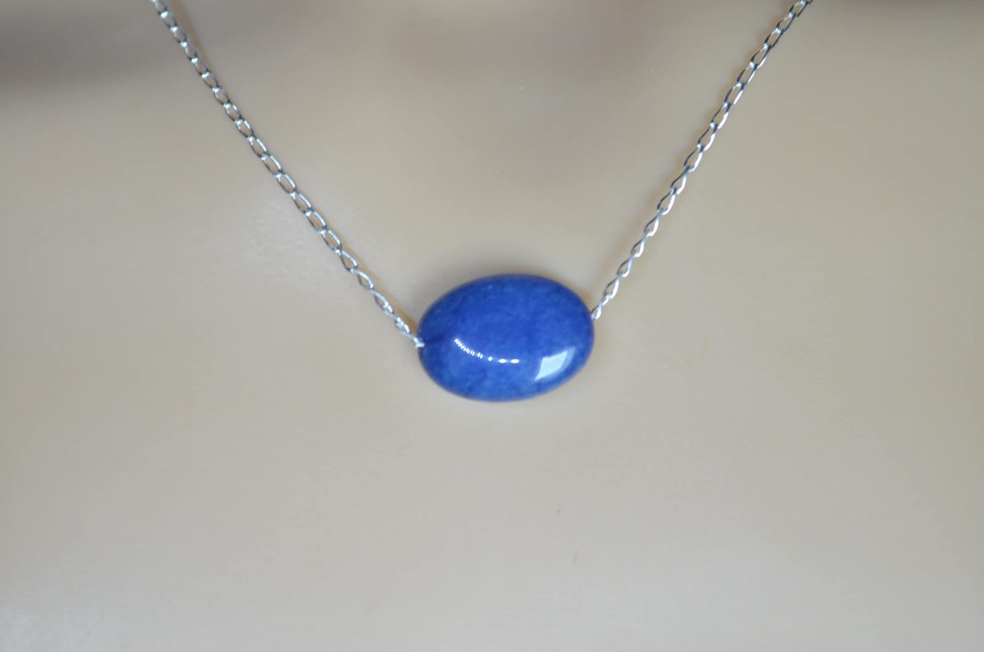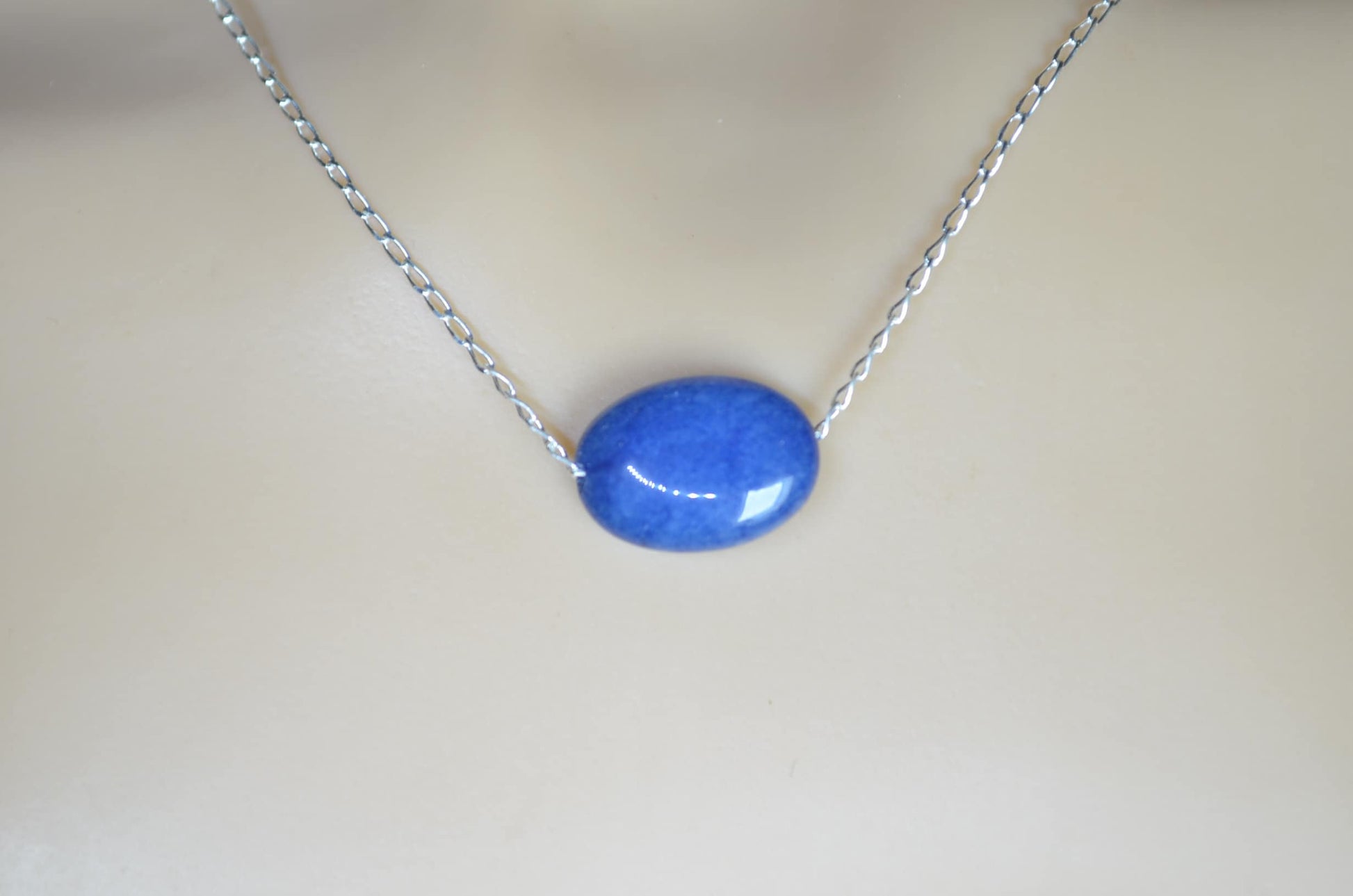 Silver blue jade necklace, oval stone bead, natural materials, 18” chain