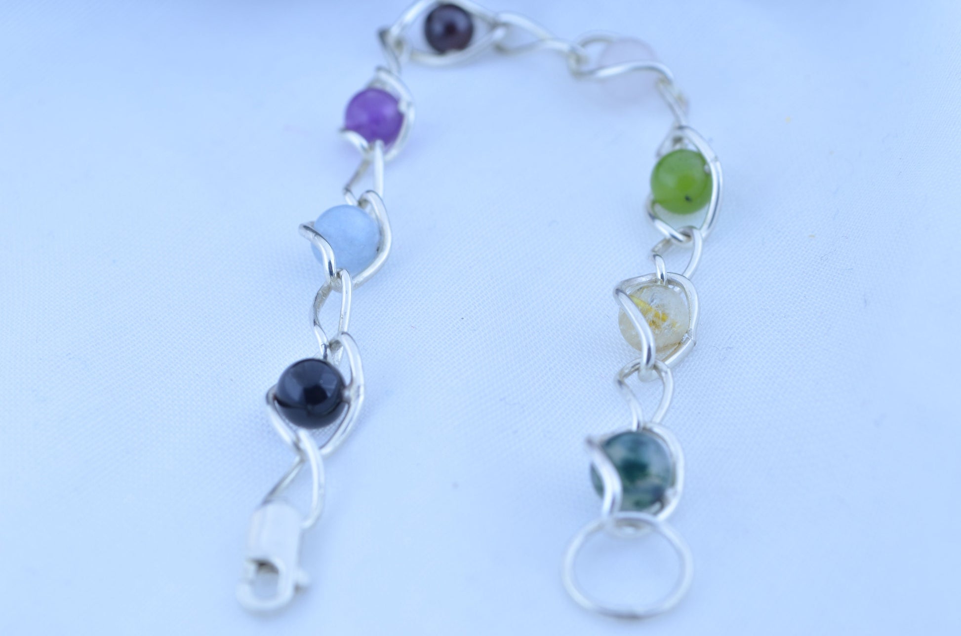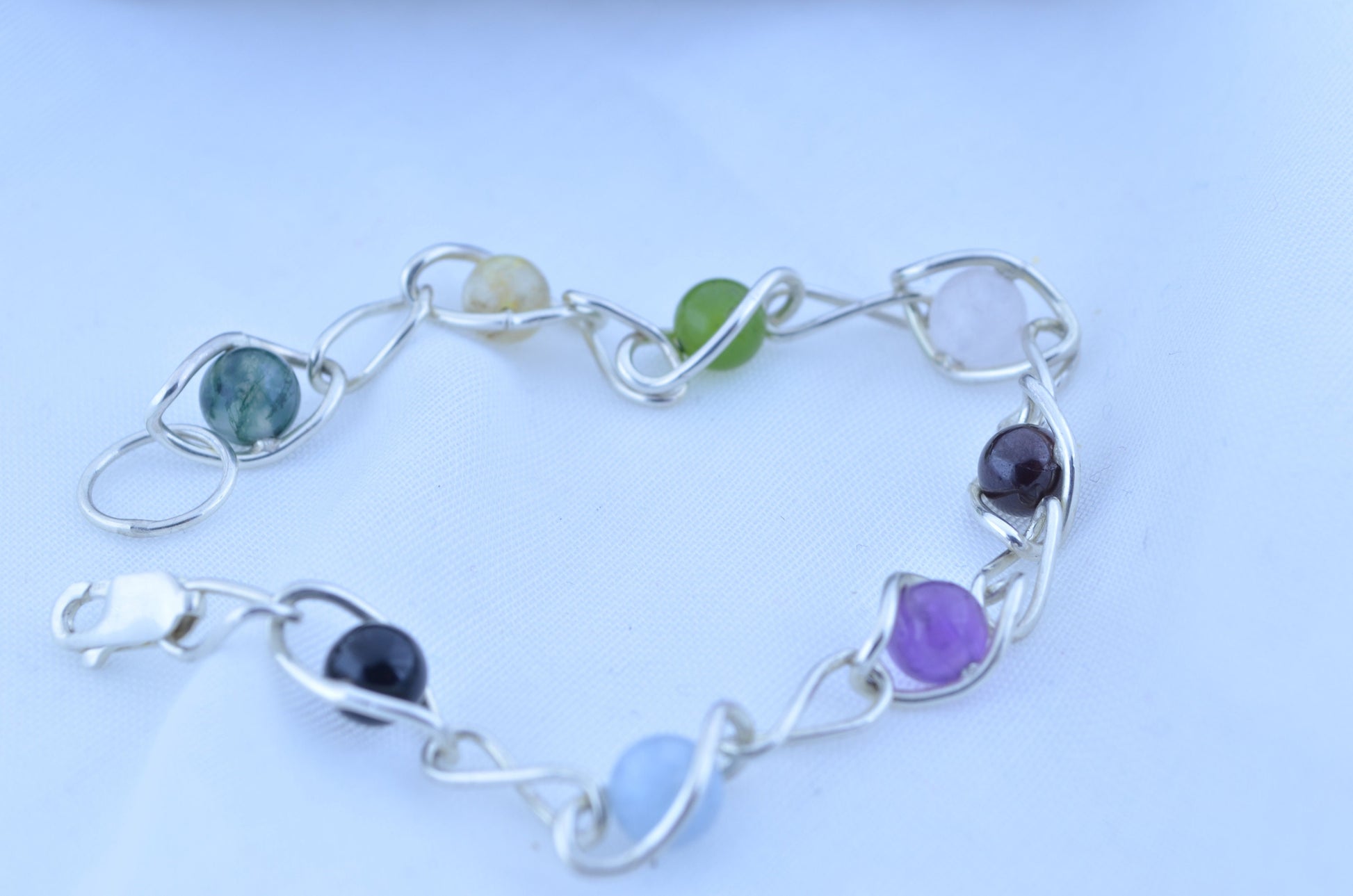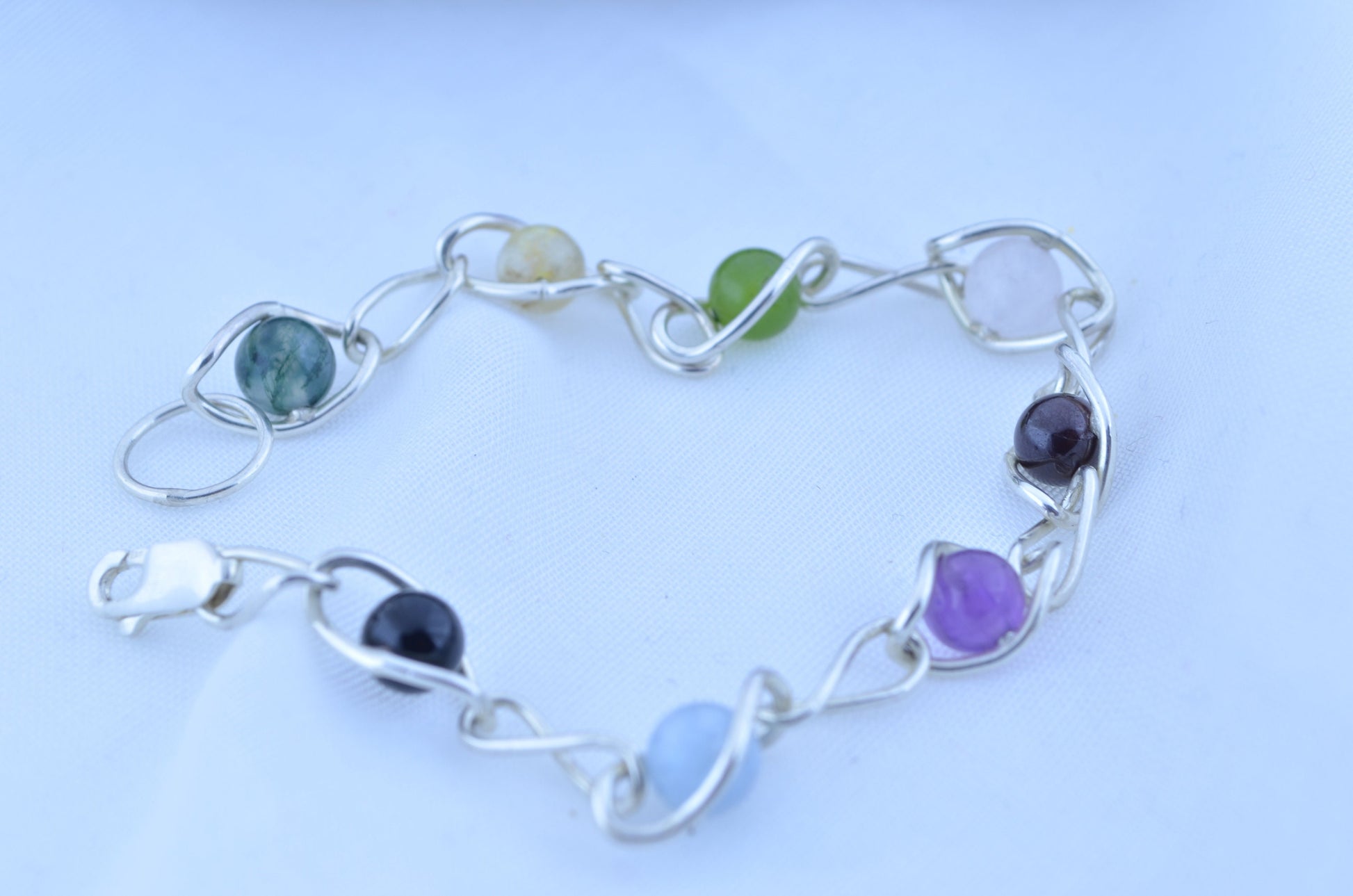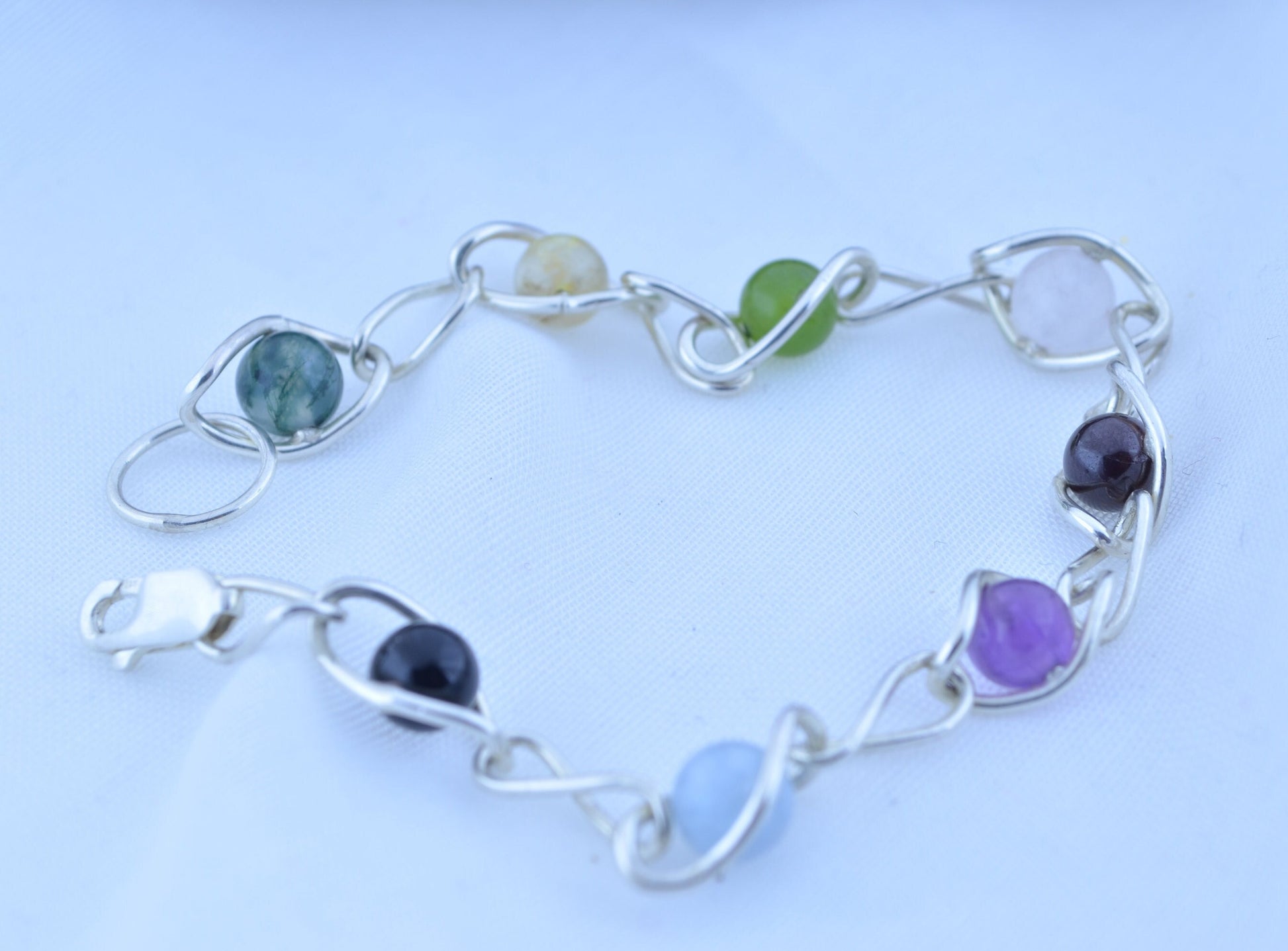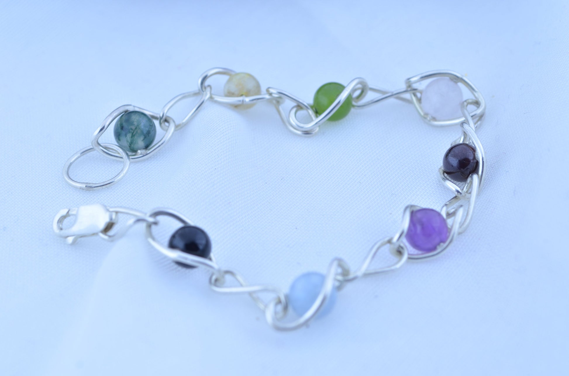 silver bracelet and natural gemstone, aquamarine, amethyst, black onyx, citrine, garnet, jade, moss agate, rose quartz