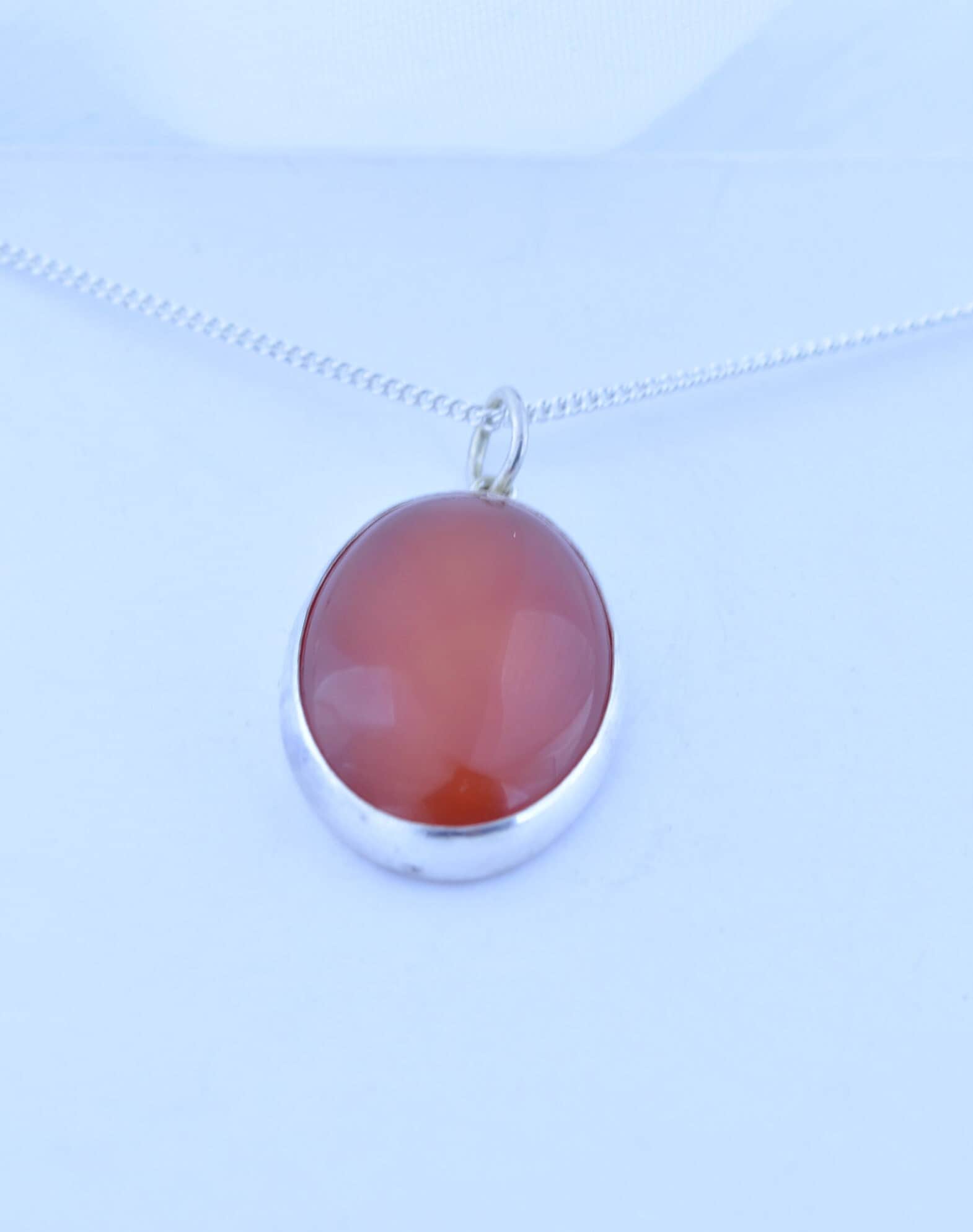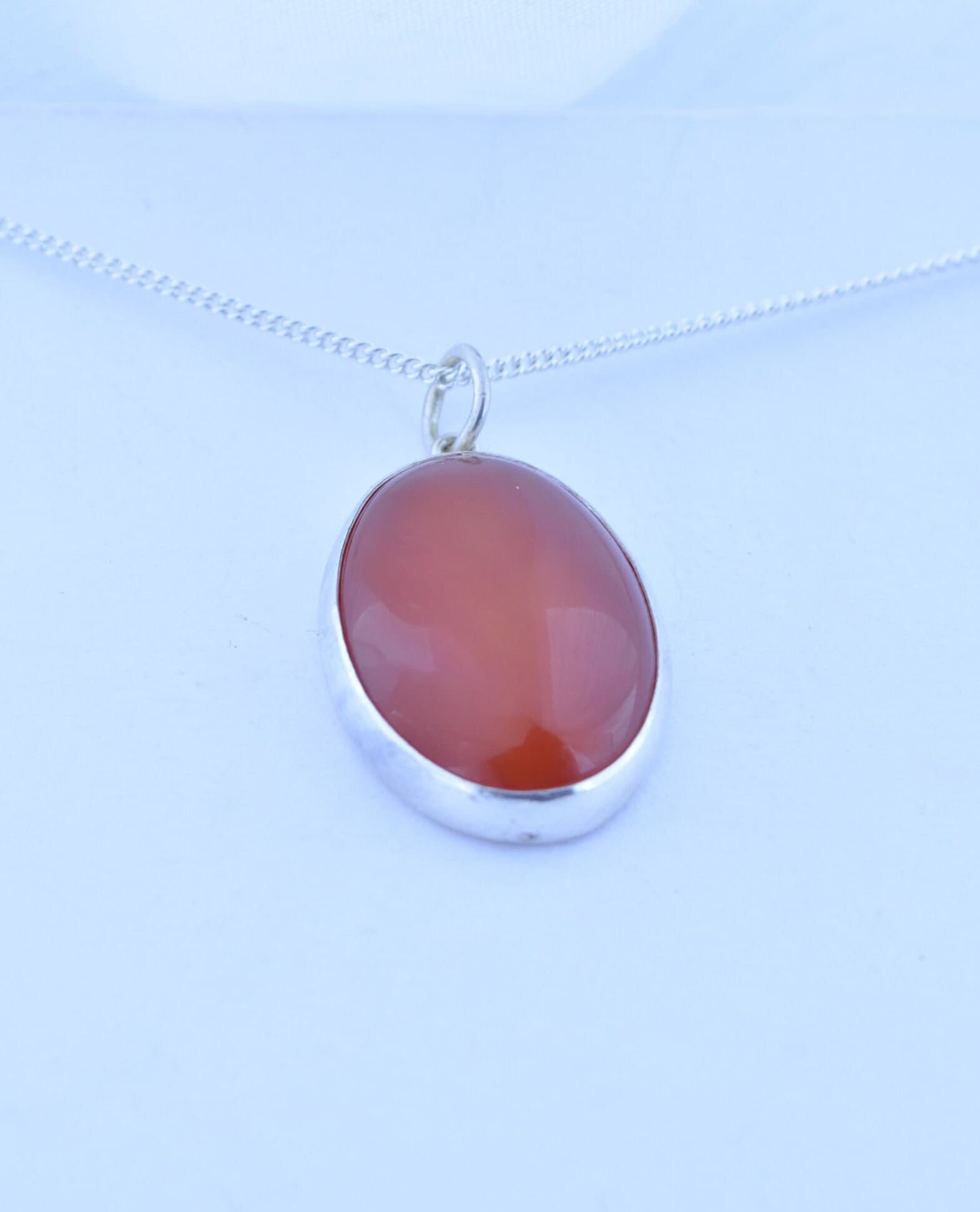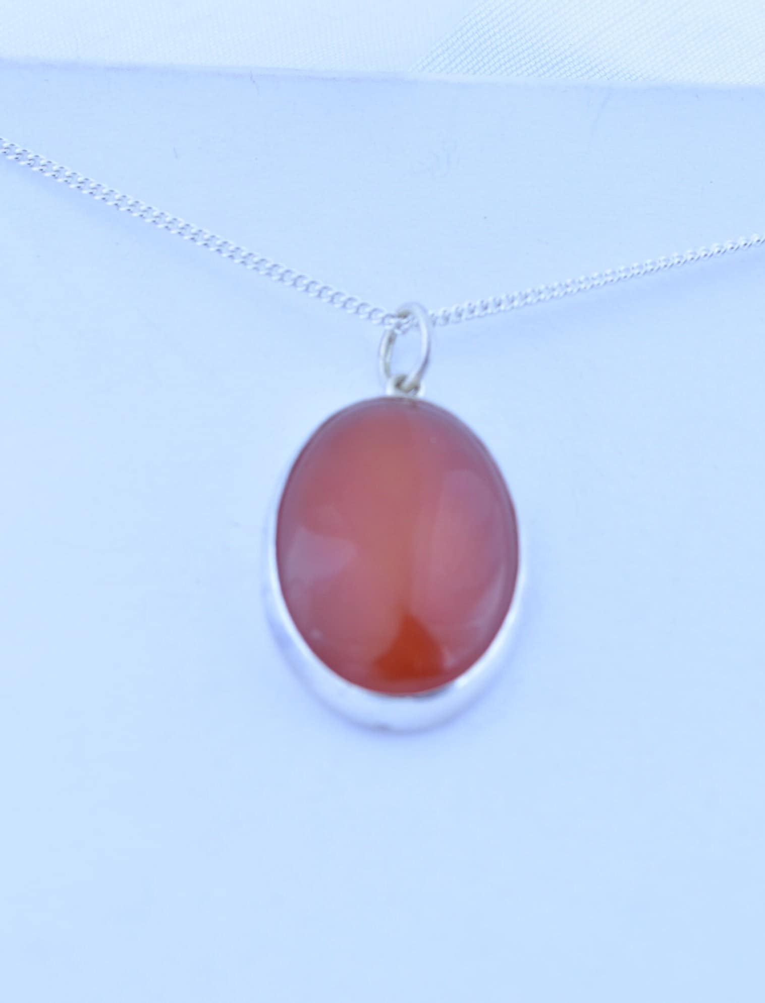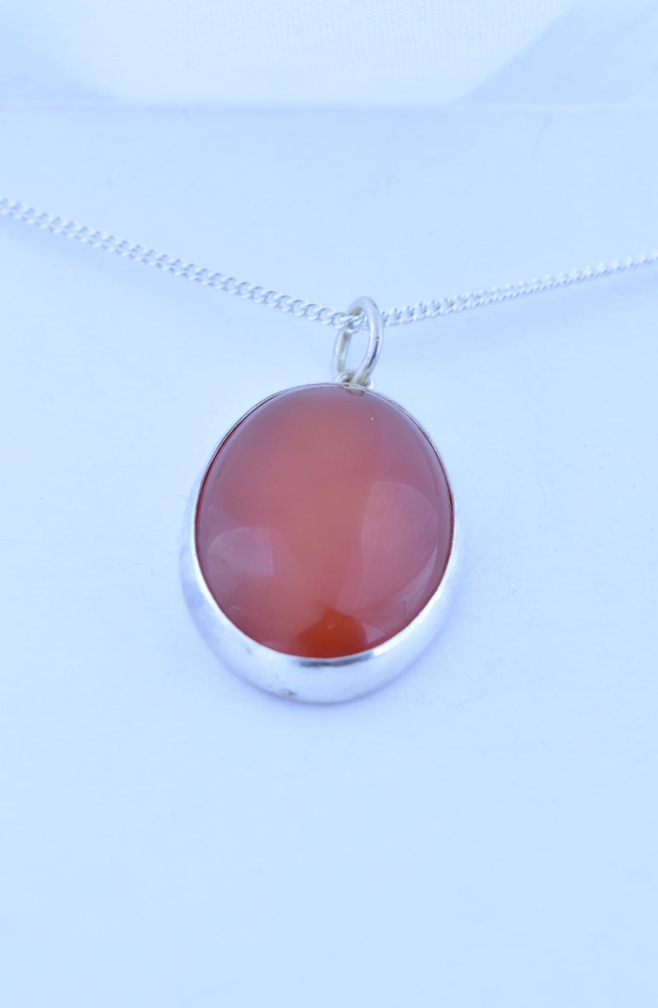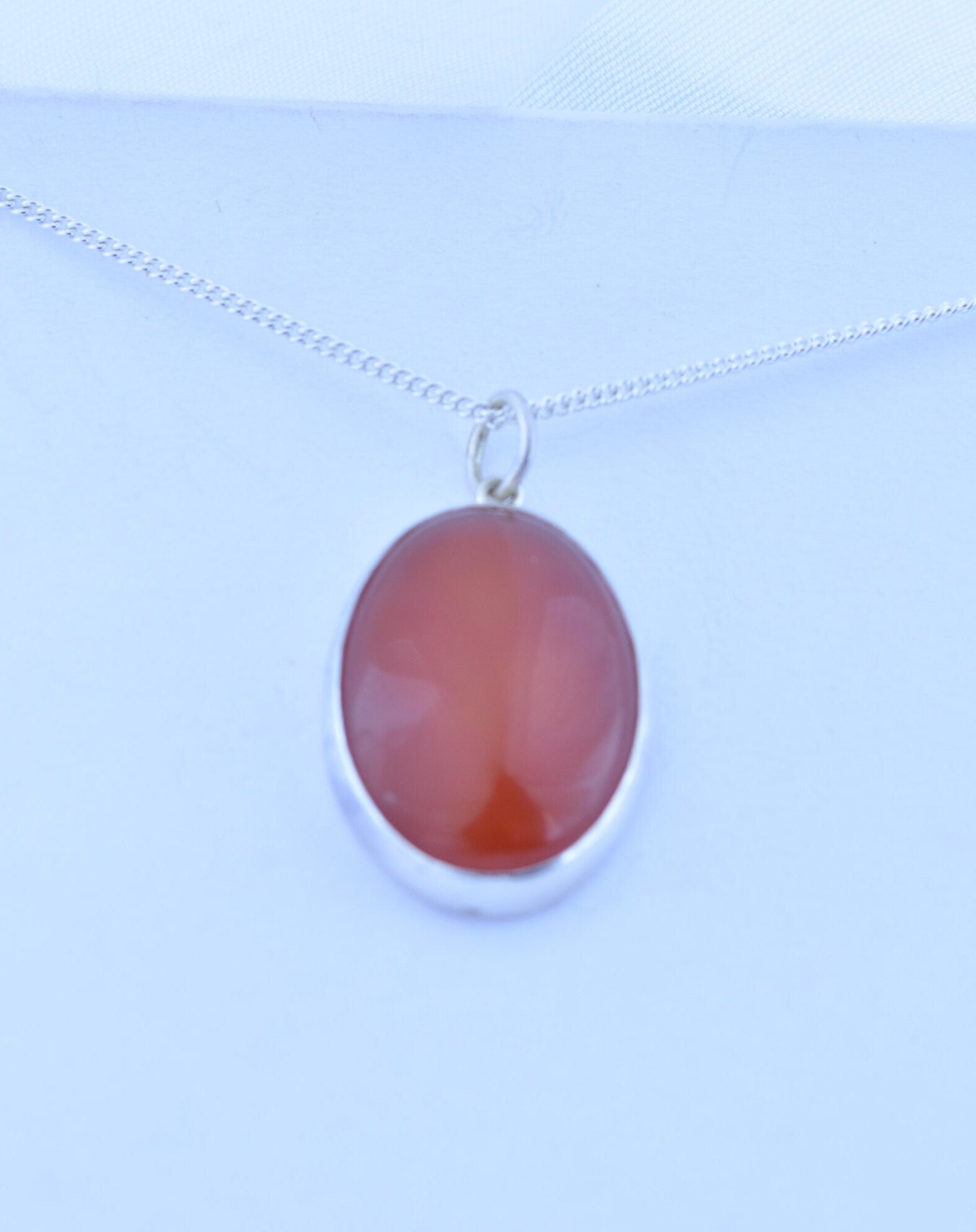 silver carnelian necklace, oval natural red gemstone pendant, 18” chain