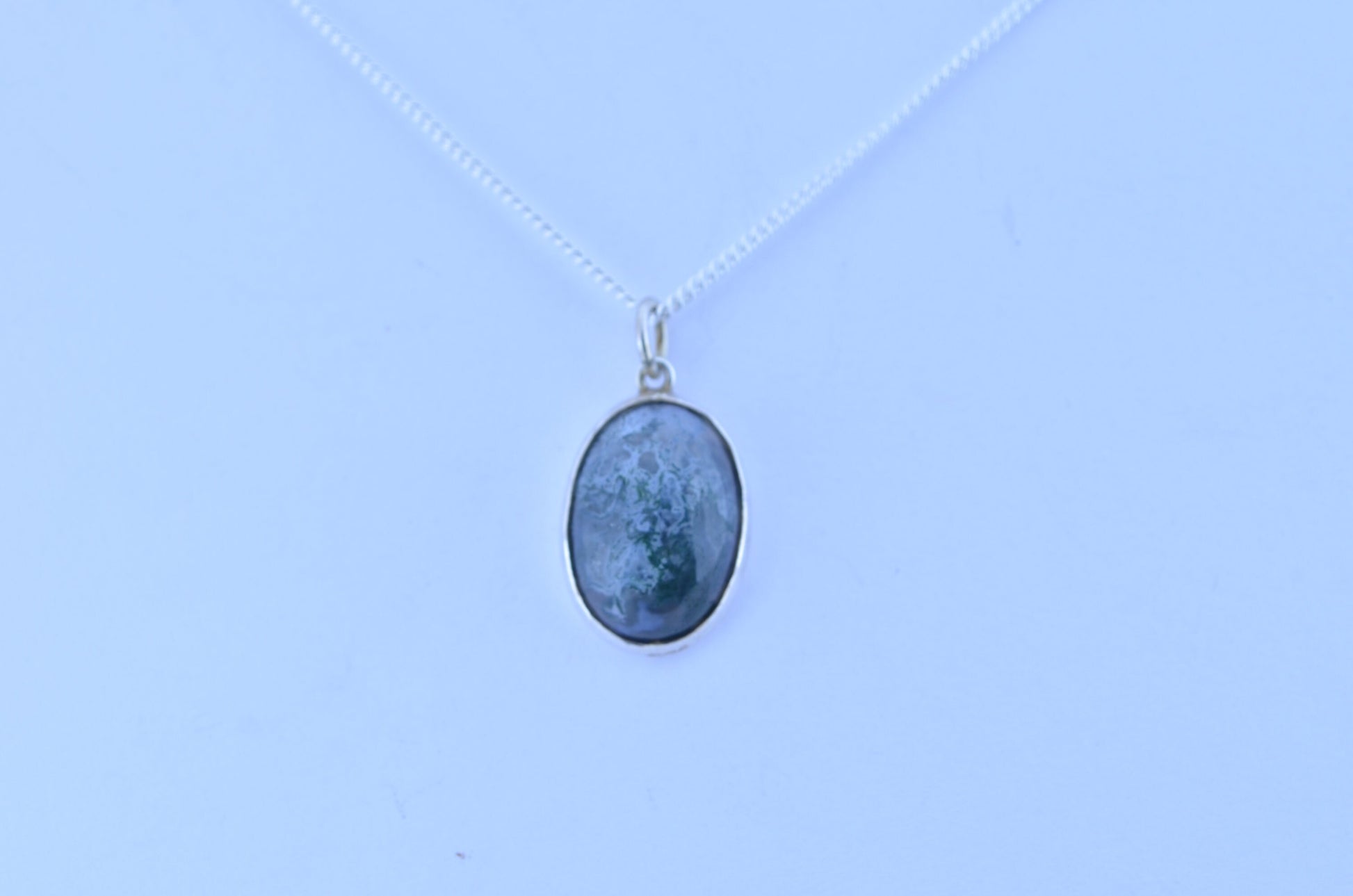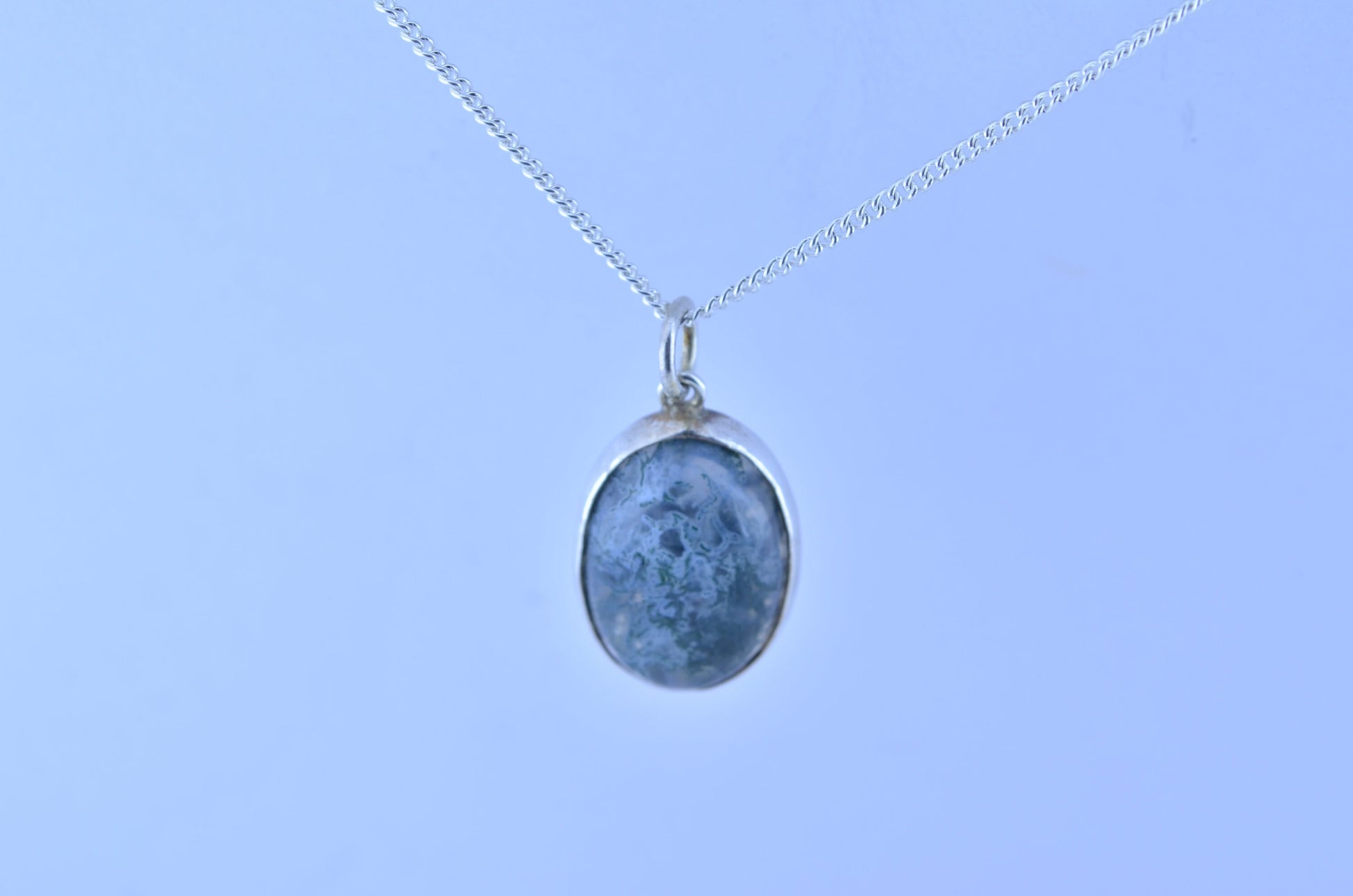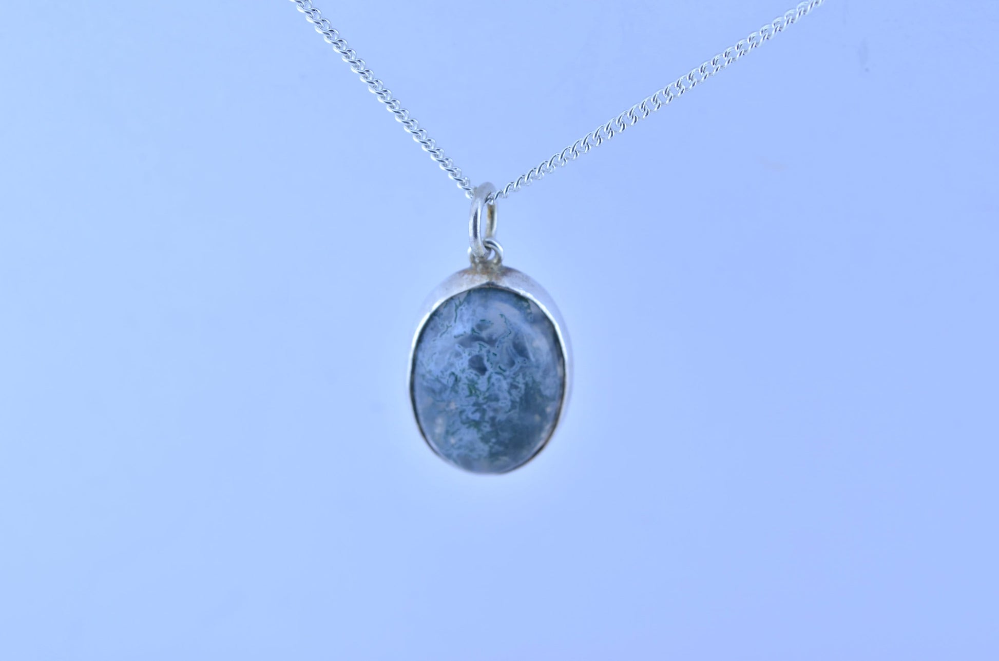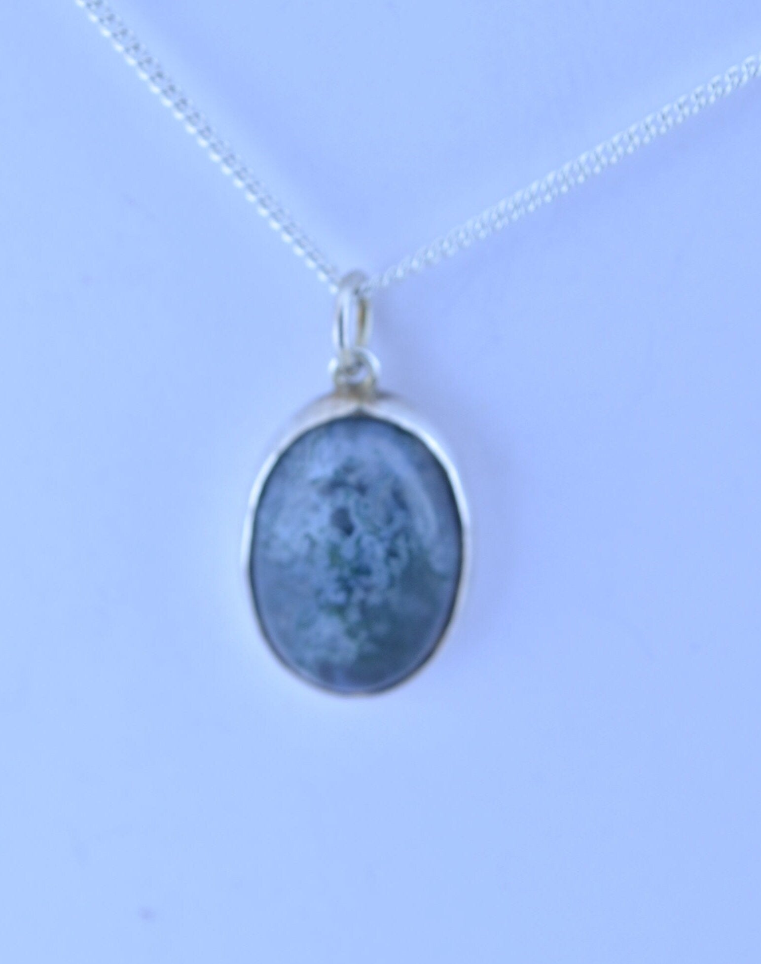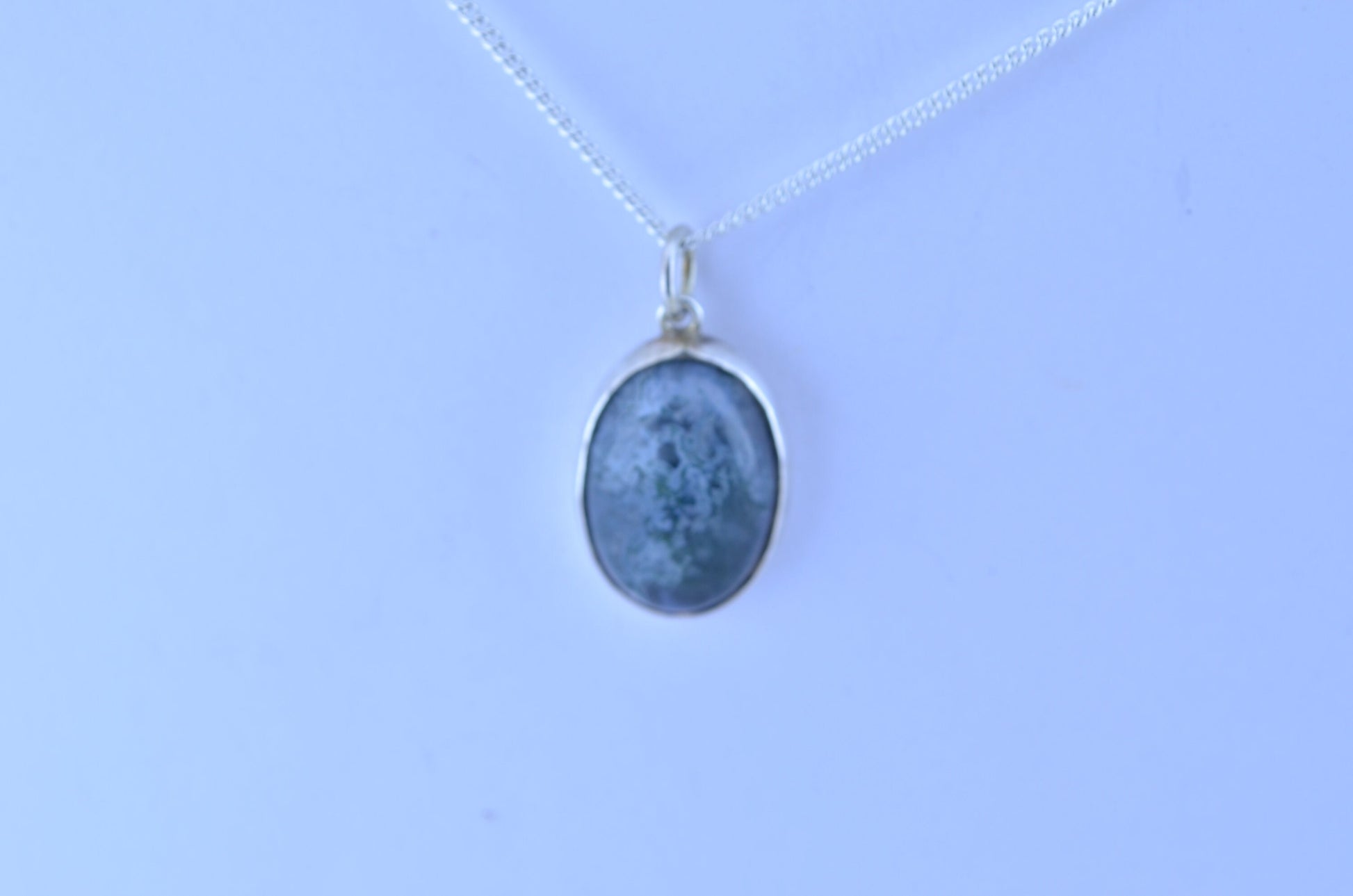 silver green moss agate pendant, oval shape natural gemstone, 18” chain
