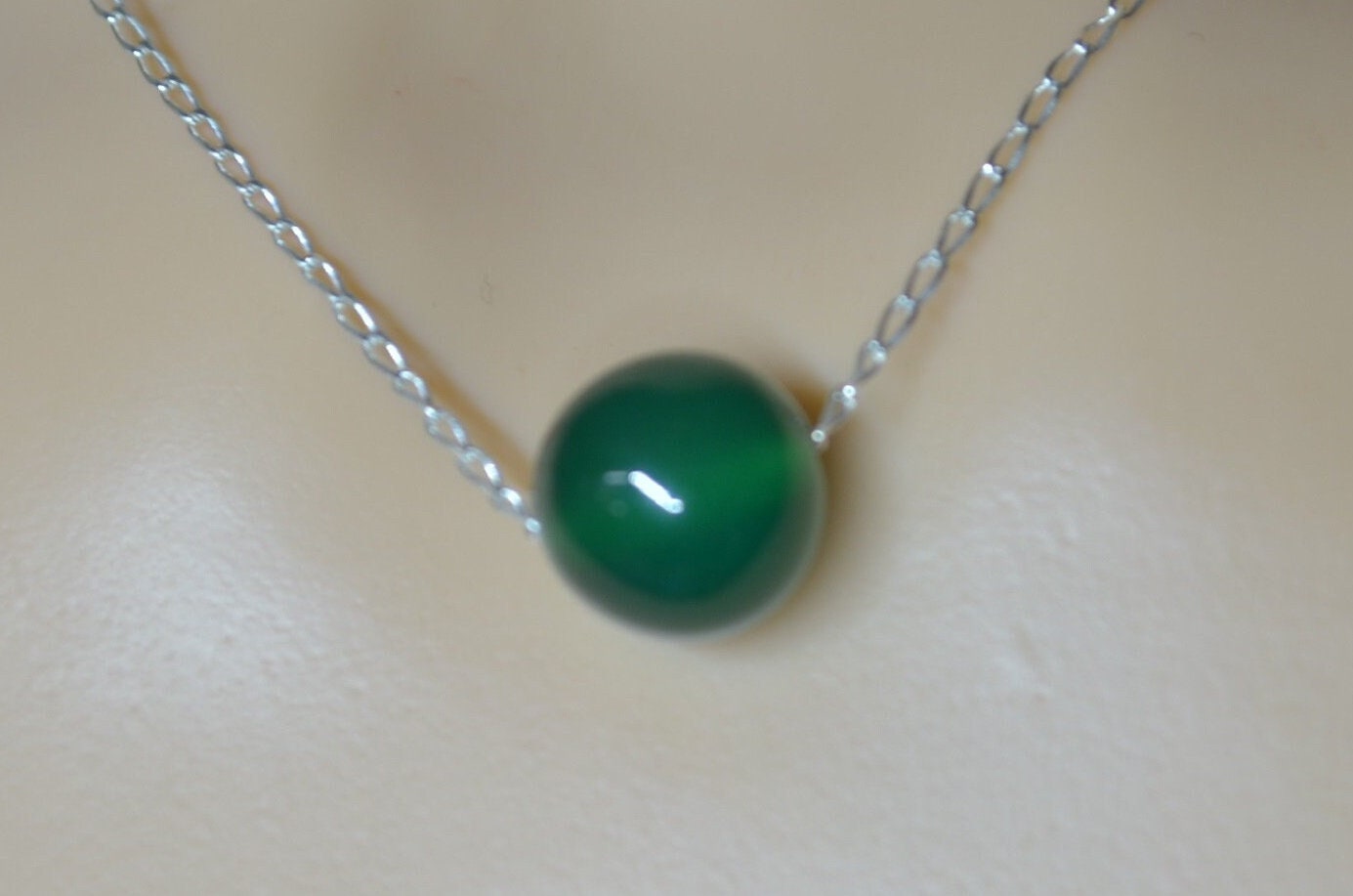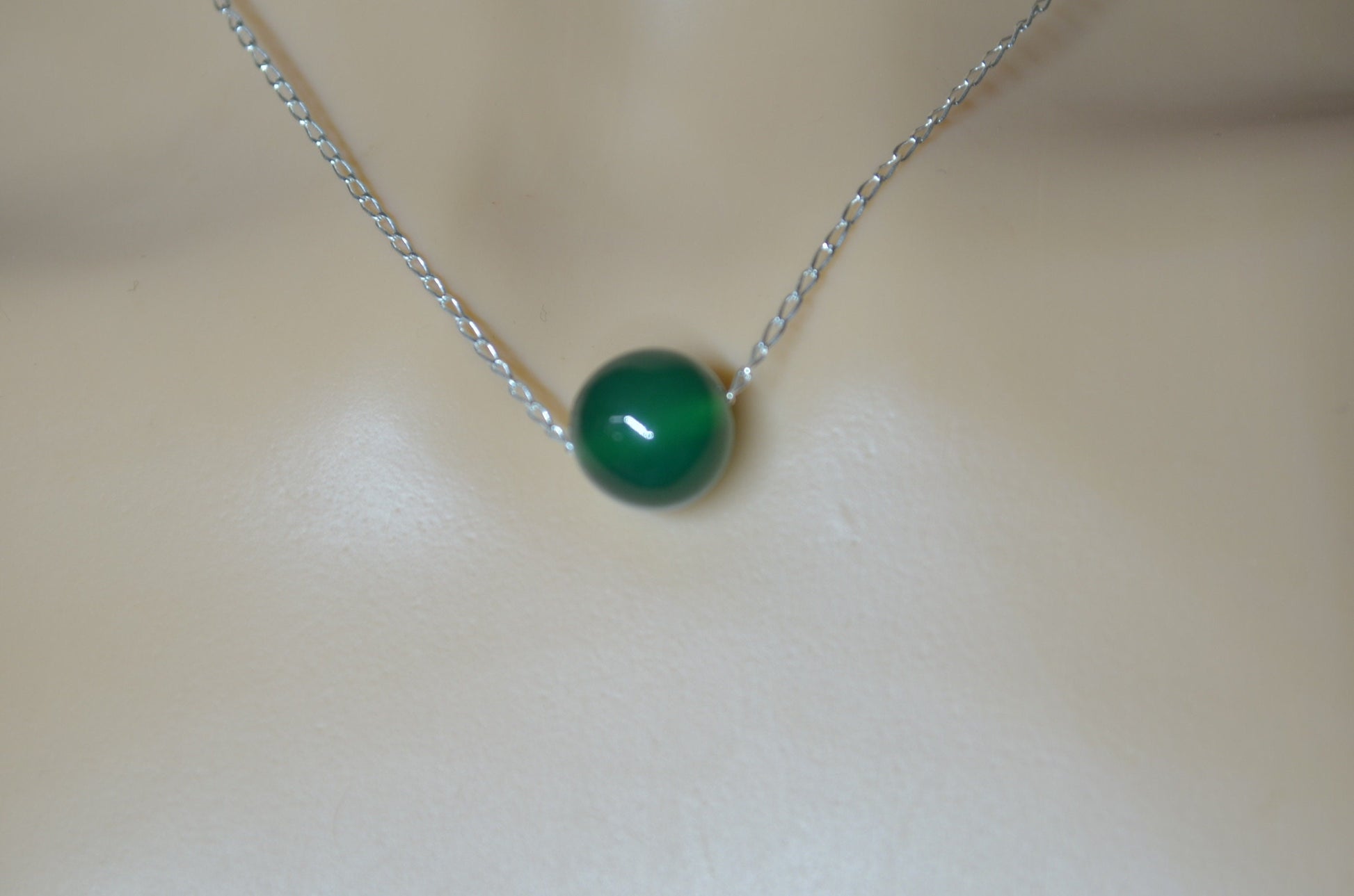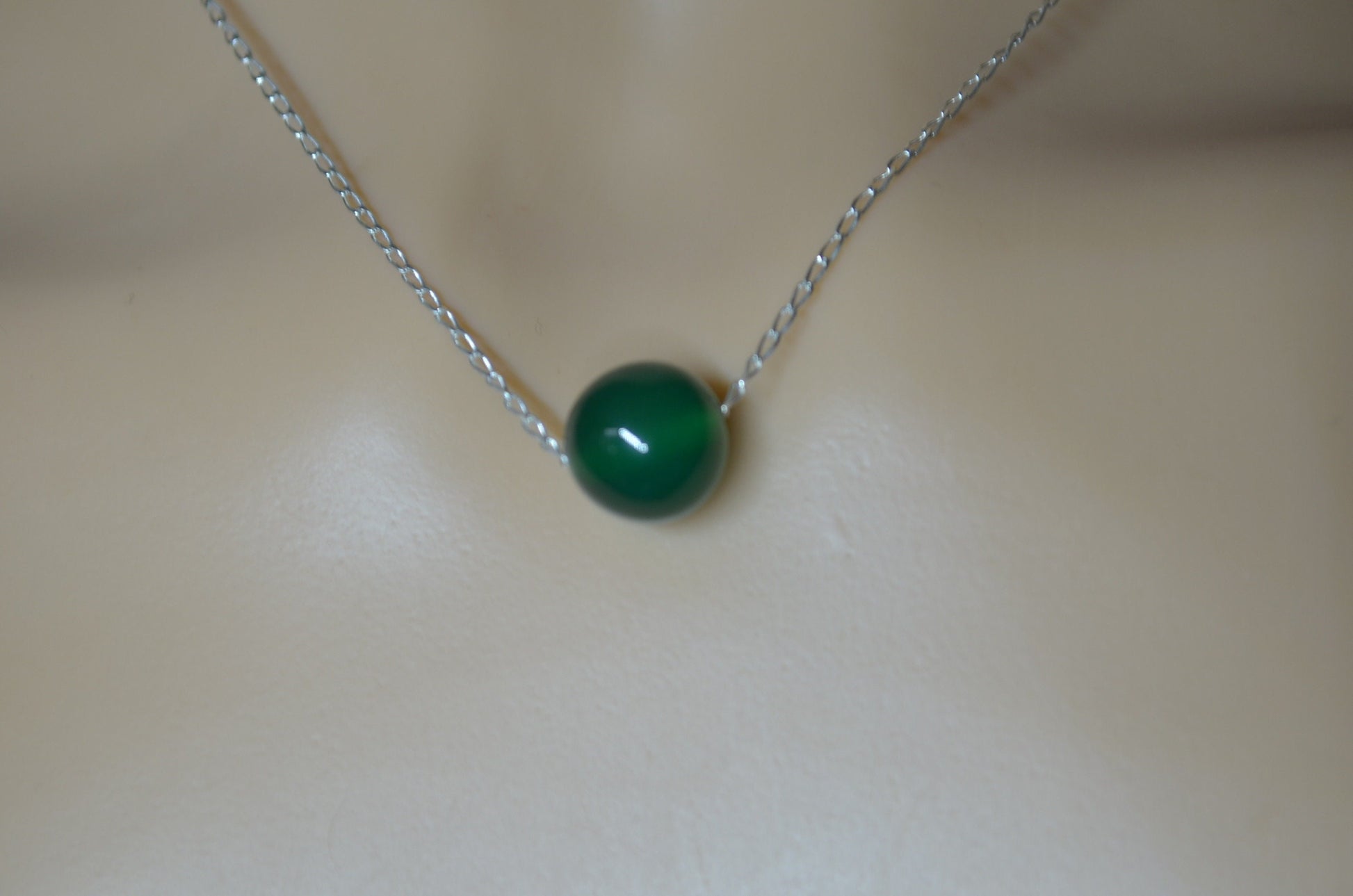 Silver necklace, green onyx bead, round shape natural gemstone, 18” chain