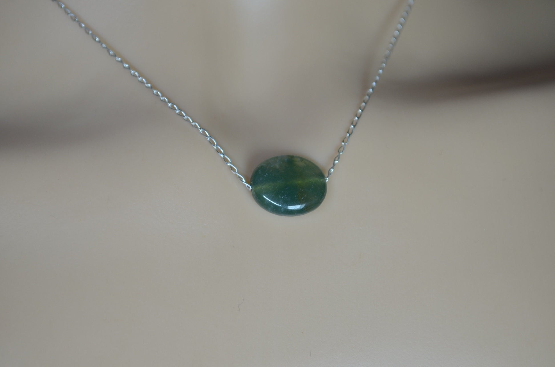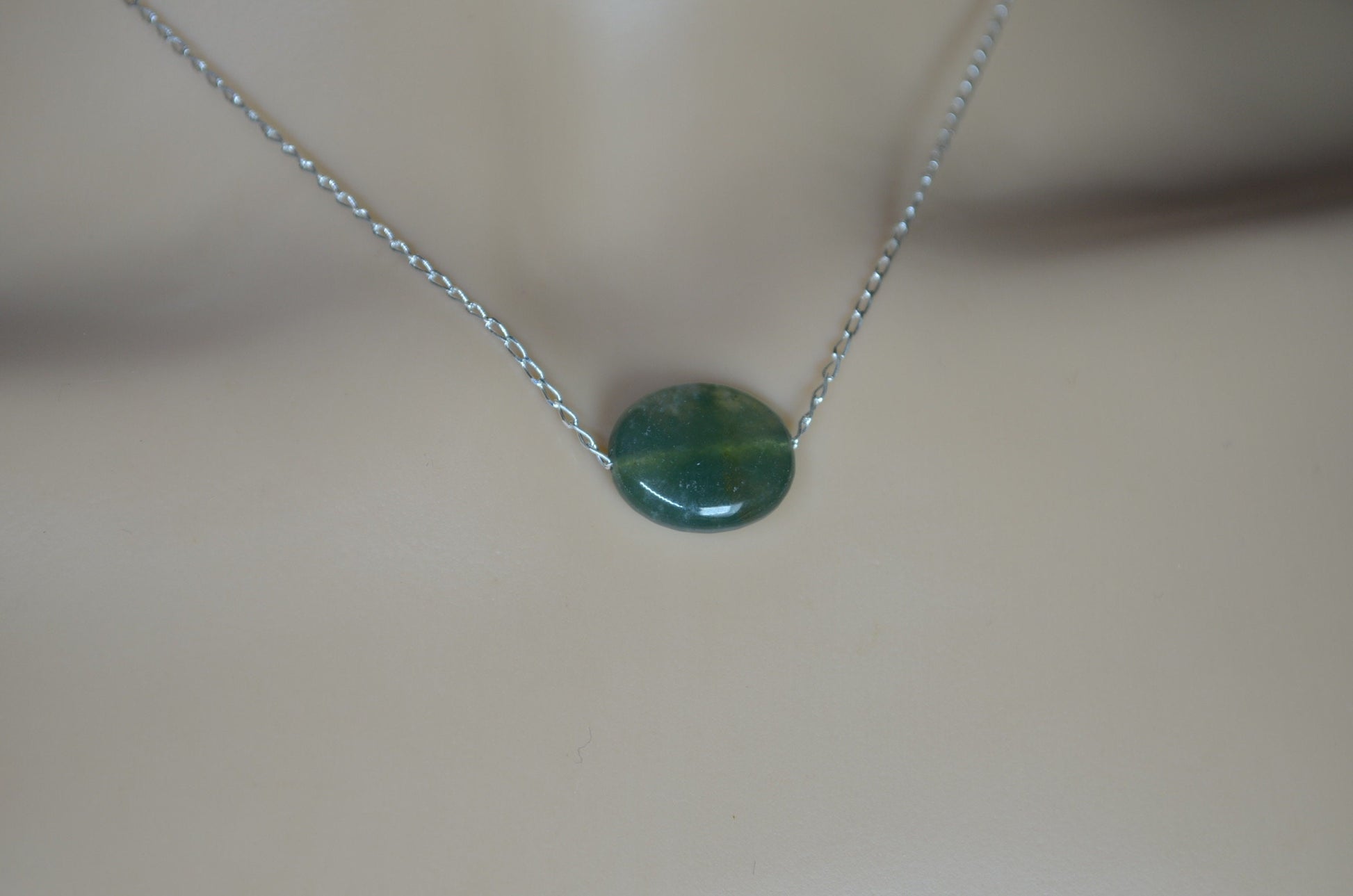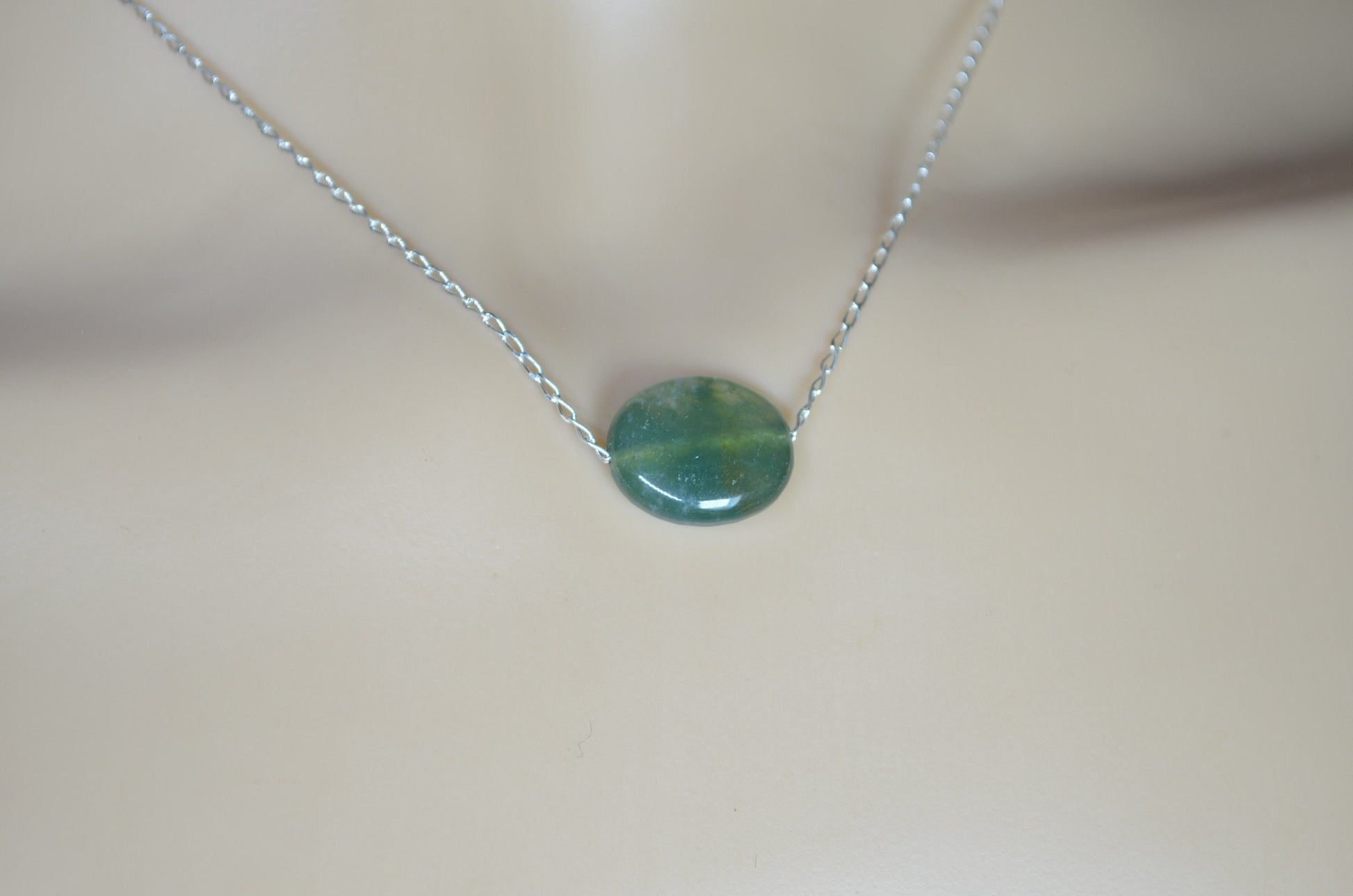 silver necklace moss agate, oval shape natural gemstone, 18” chain