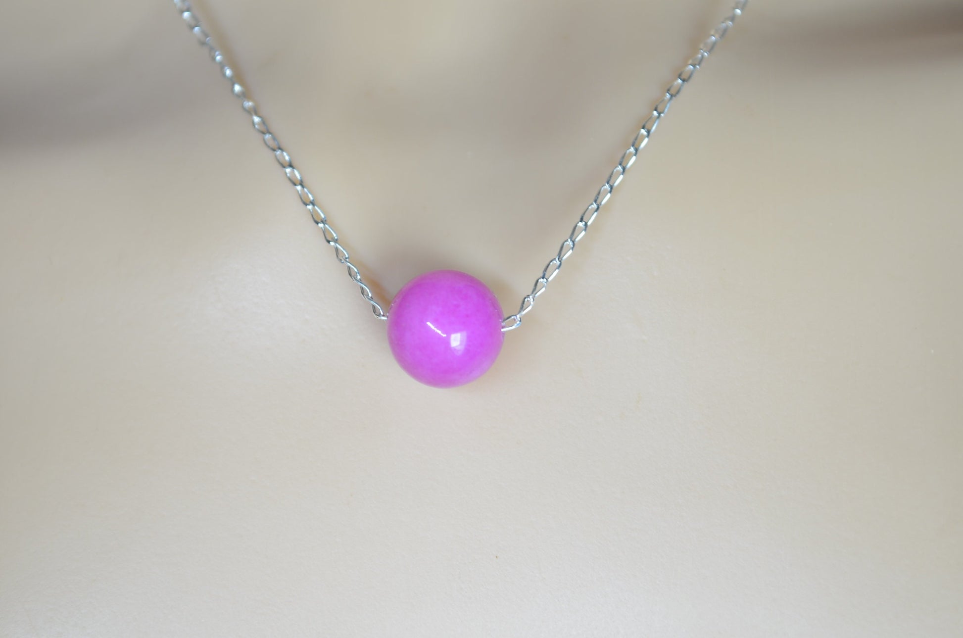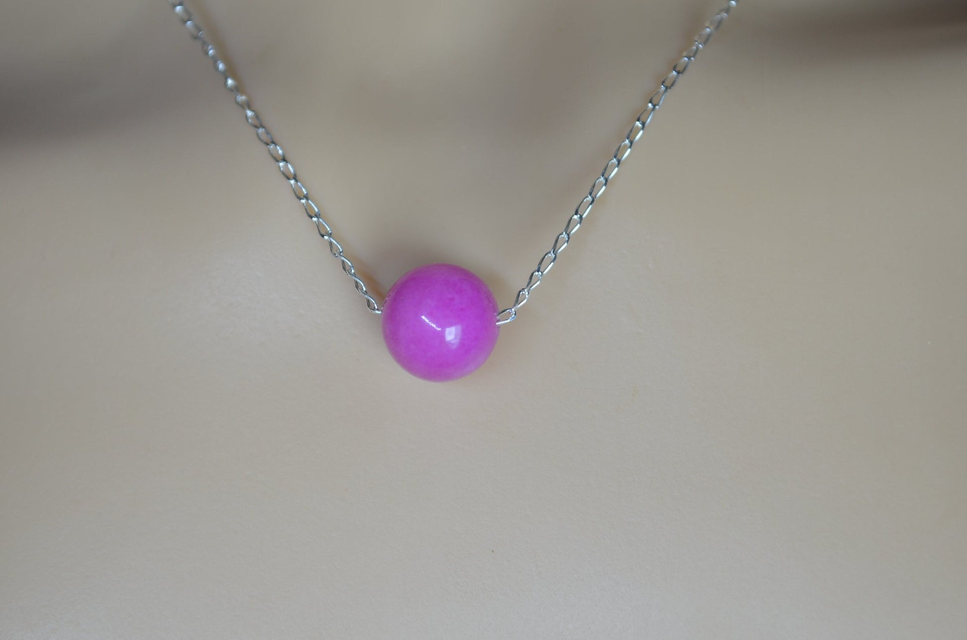silver pink jade necklace, round shape bead pendant, 18” chain