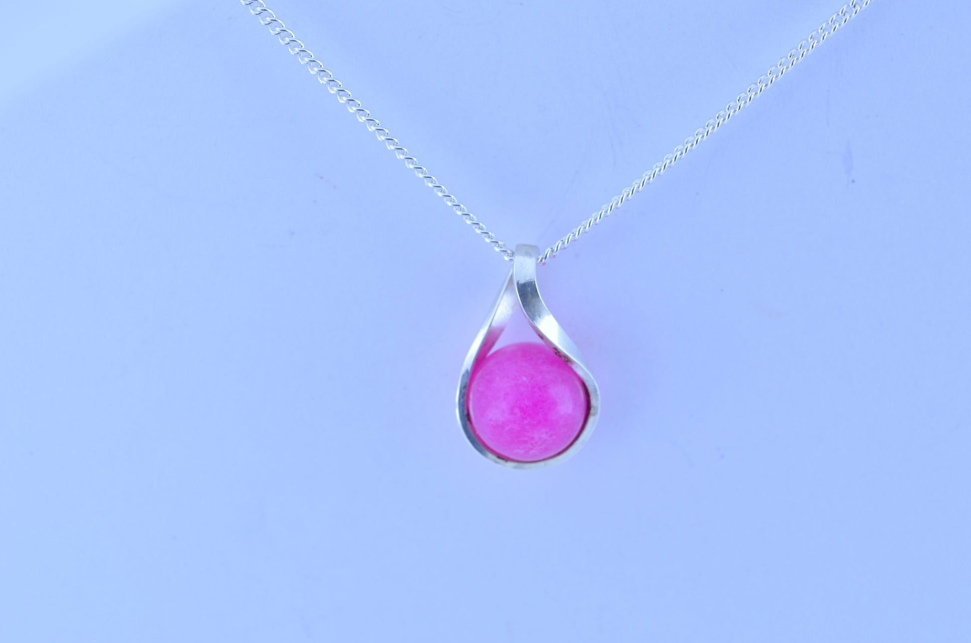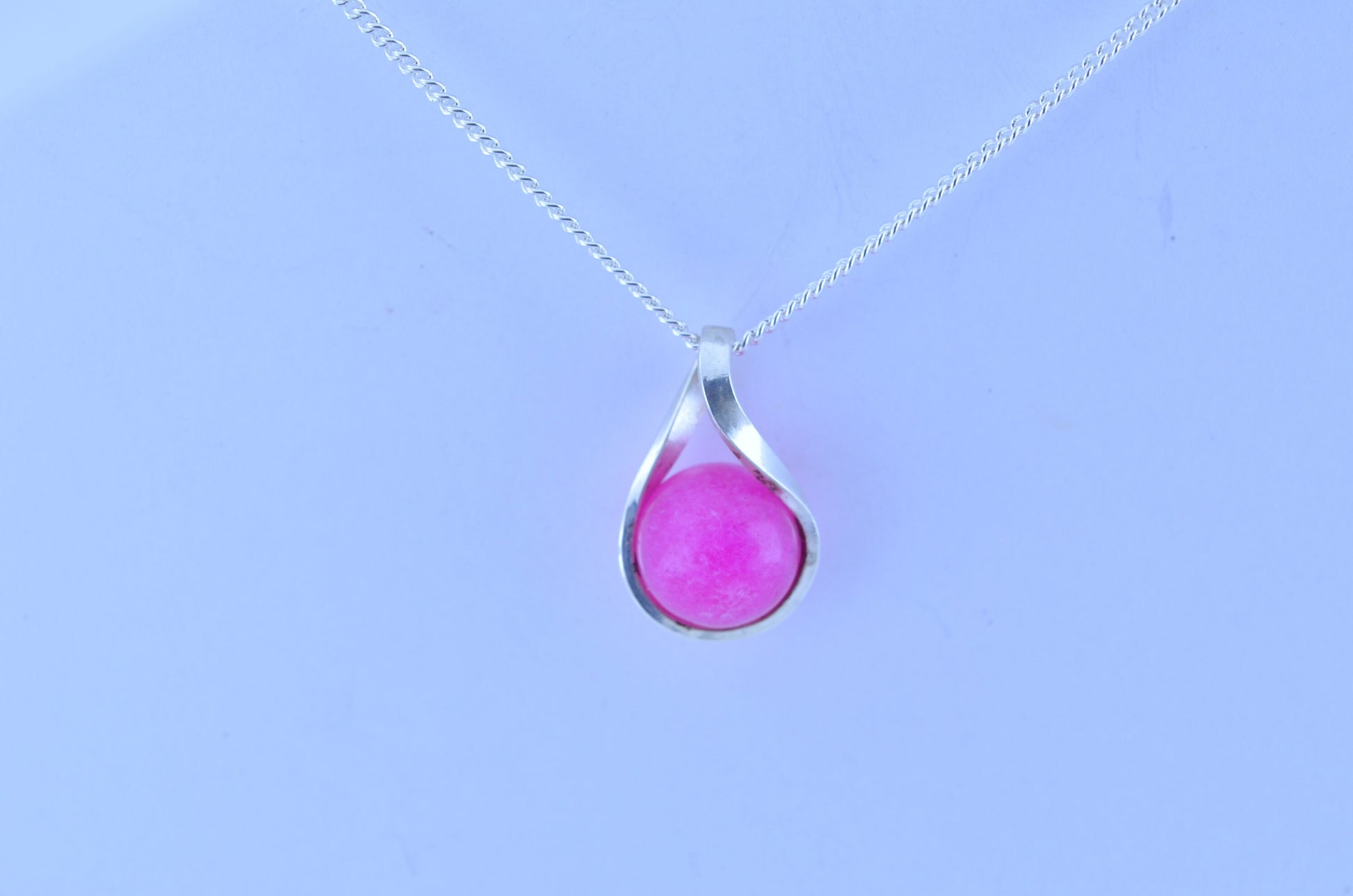 Silver pink jade necklace, twisted round stone pendant, 18” chain