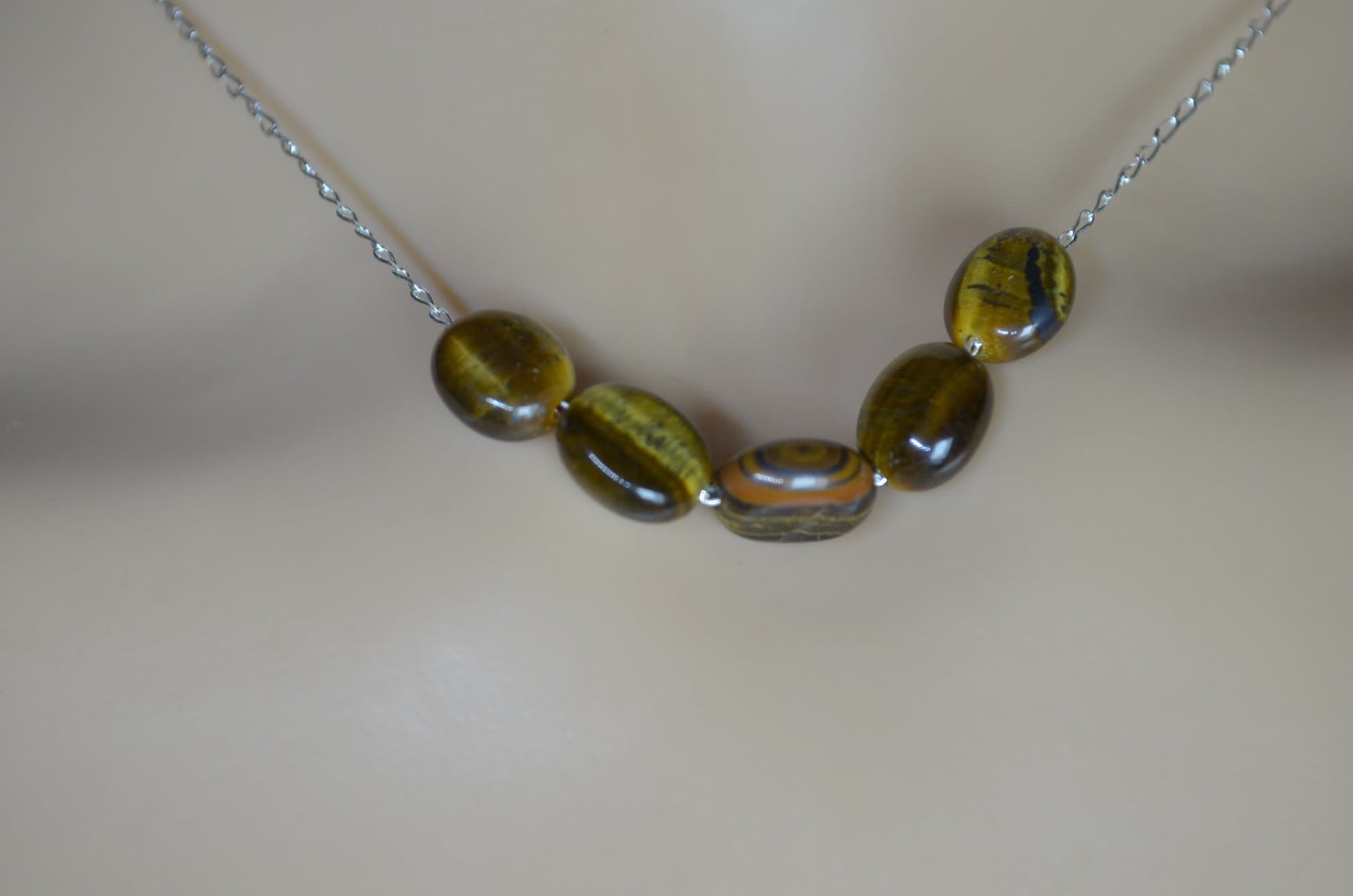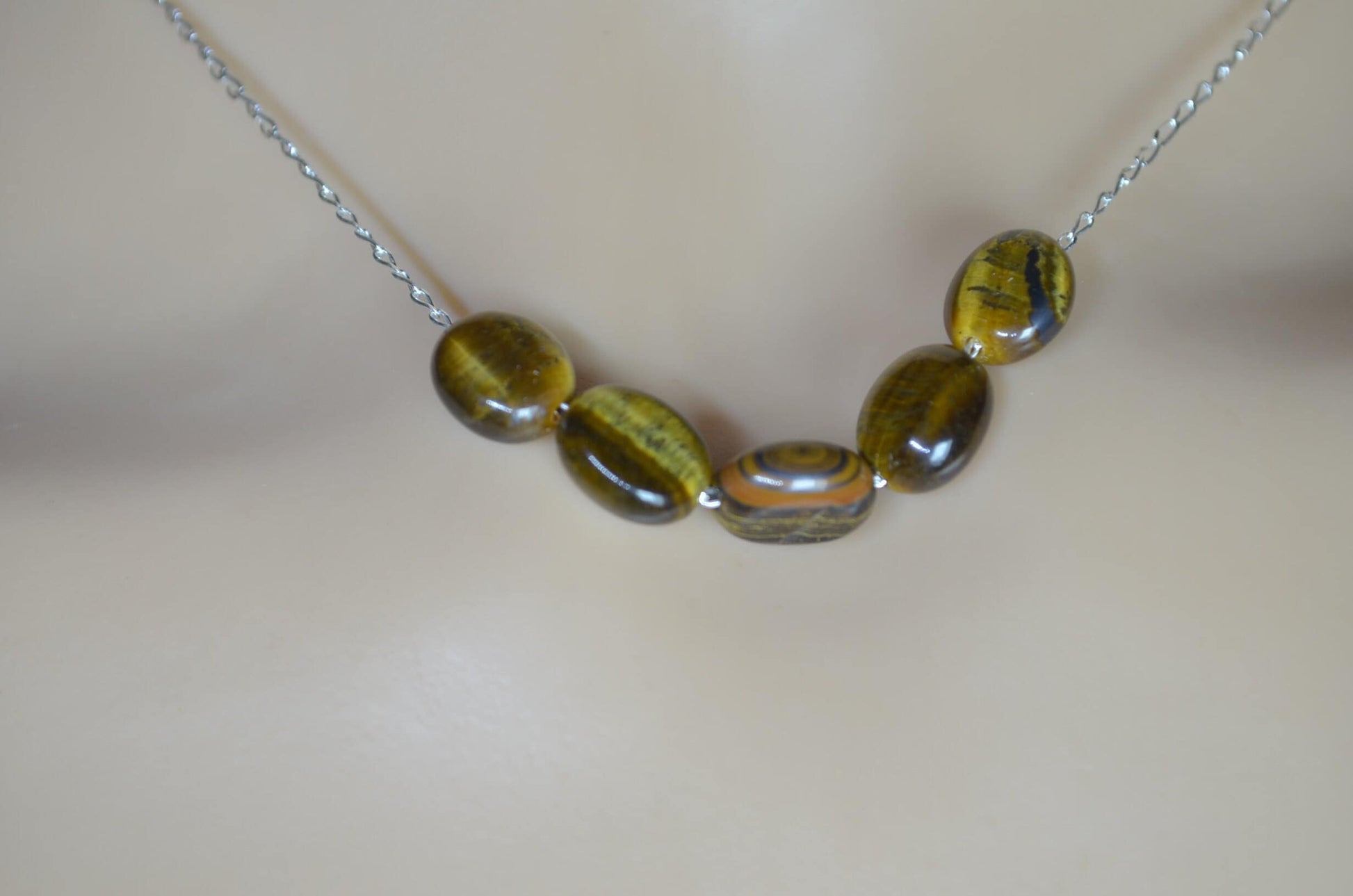 tiger’s eye 5 beads necklace, round natural brown gemstone , 18” solid sterling silver chain