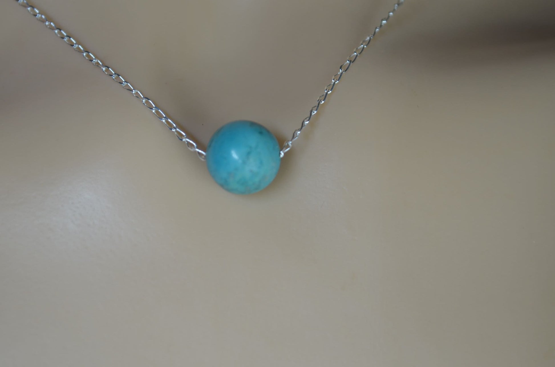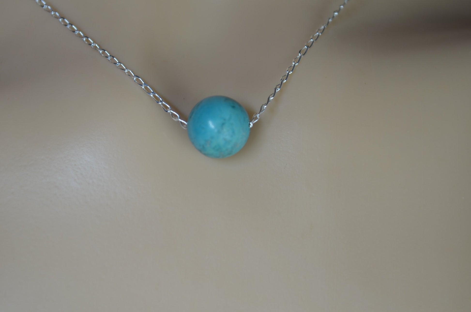 turquoise bead silver necklace, round blue pendant, 18” chain