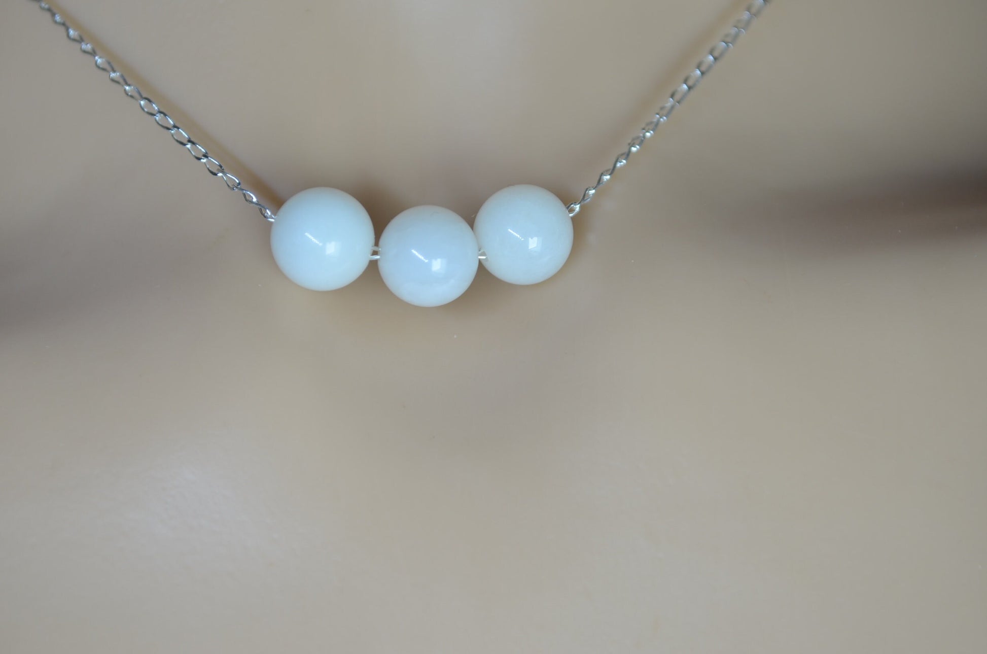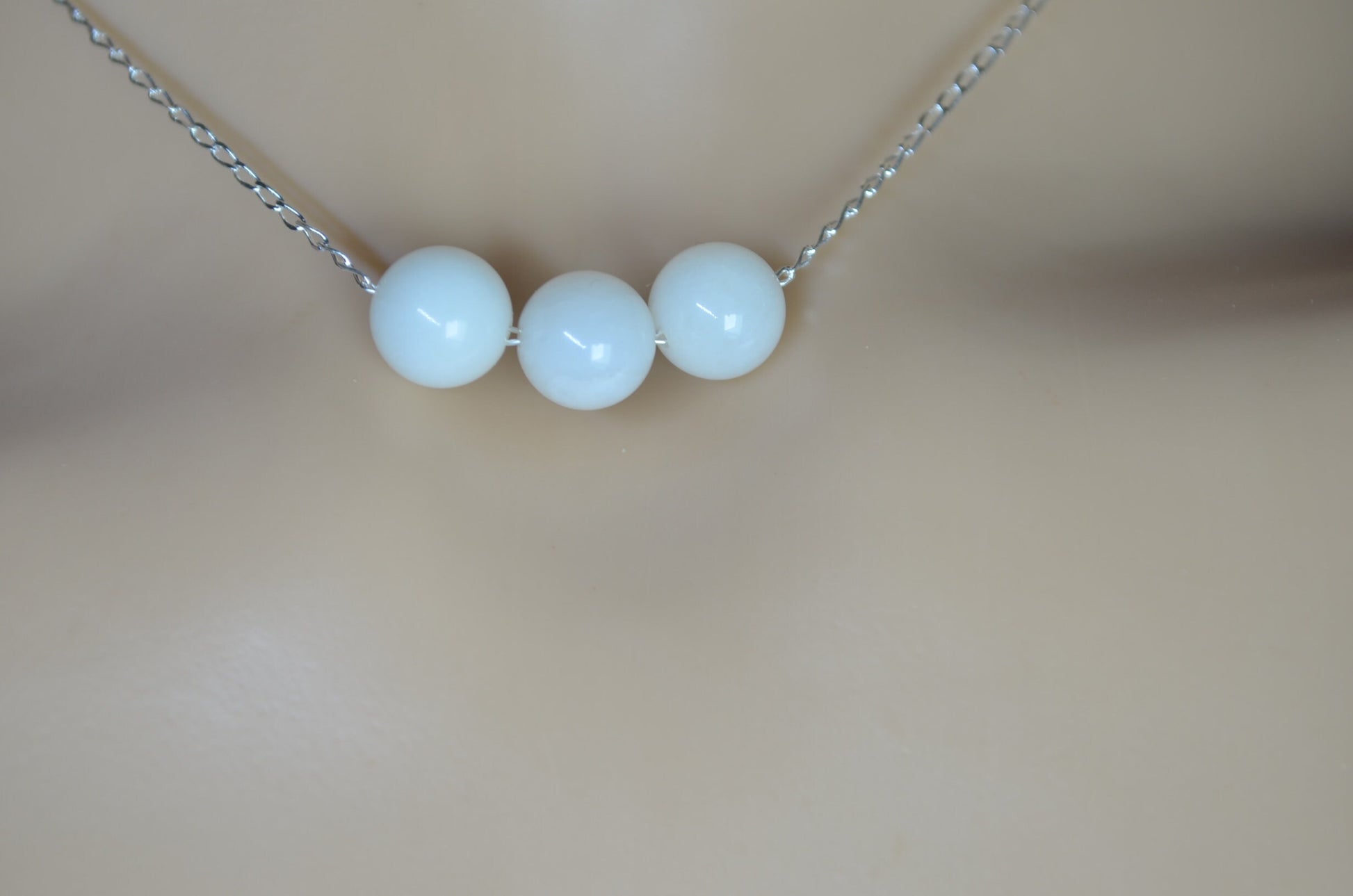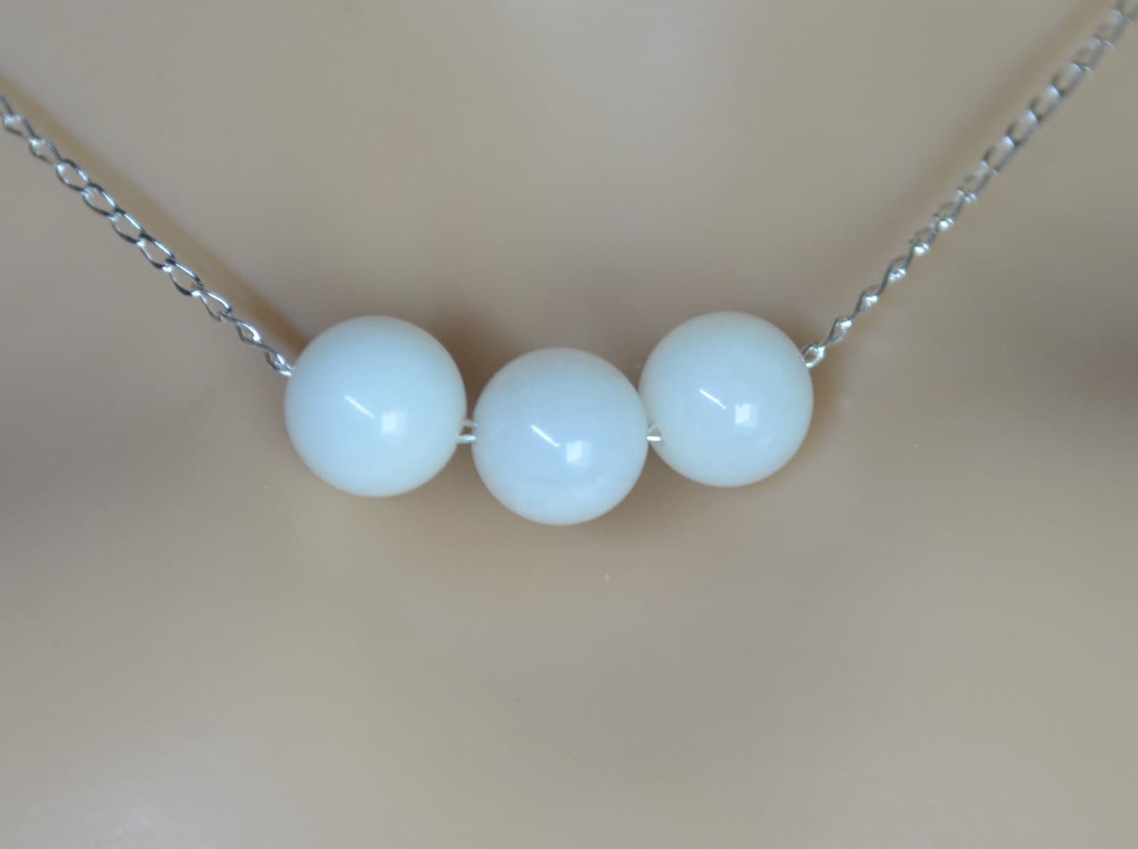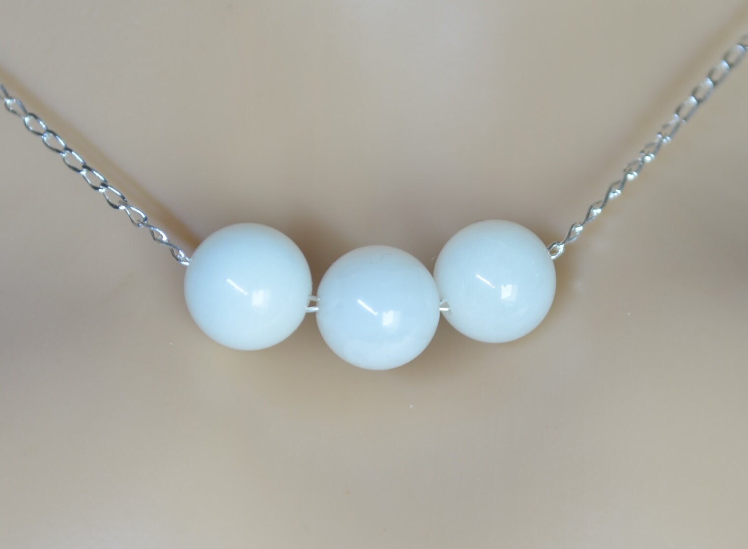 white moonstone 3 beads silver necklace, round shape natural stone pendant, 18” chain